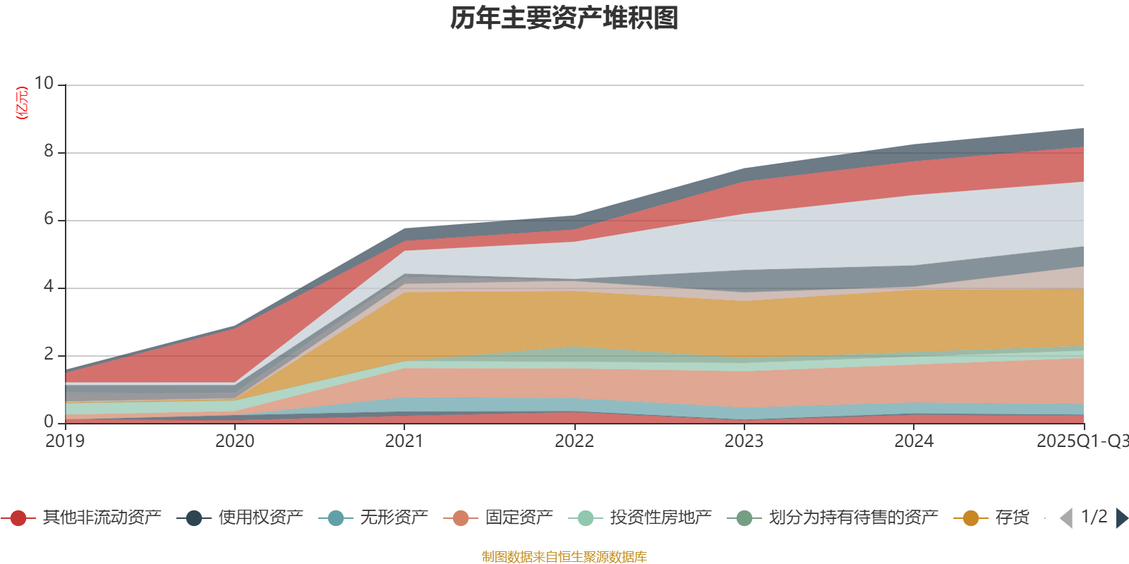 资产重大变化方面,截至2025年三季度末,公司预付款项较上年末增加569.99%,占公司总资产比重上升6.46个百分点;应收票据及应收账款较上年末减少8.07%,占公司总资产比重下降3.32个百分点;存货较上年末减少7.99%,占公司总资产比重下降2.91个百分点;其他流动资产较上年末减少81.97%,占公司总资产比重下降2.58个百分点。