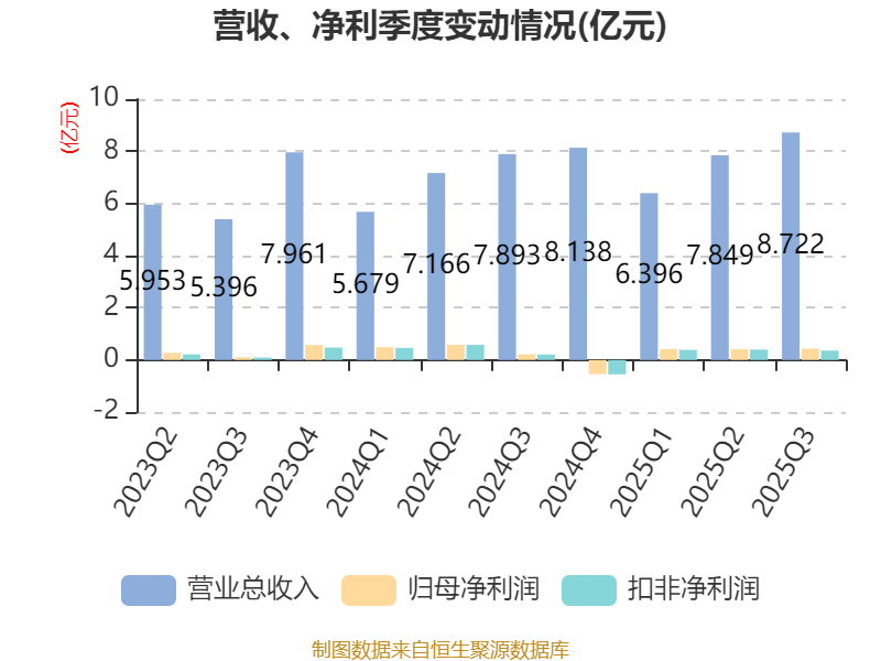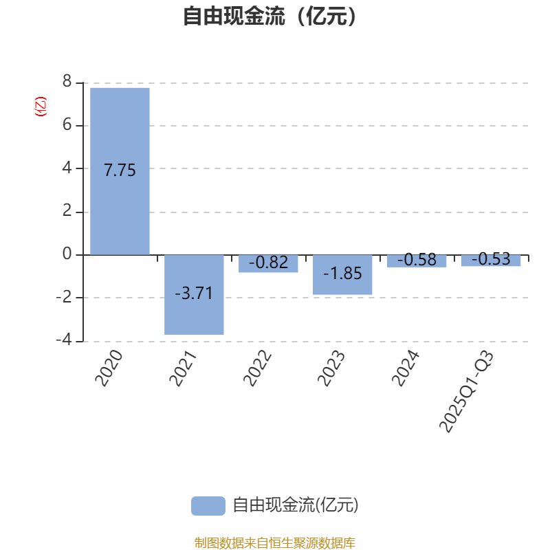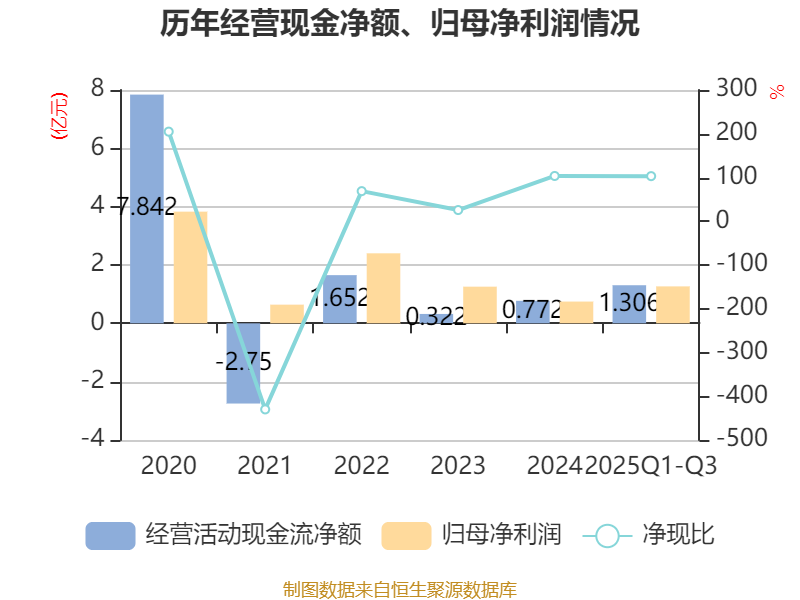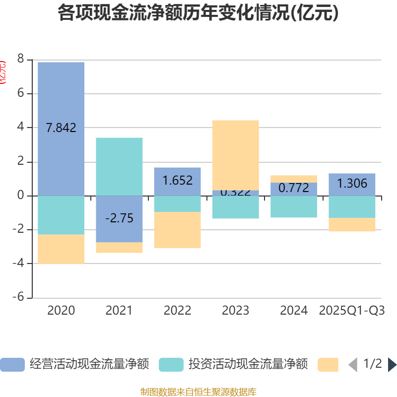 2025年前三季度,公司经营活动现金流净额为1.31亿元,同比增加8.01亿元;筹资活动现金流净额-7837.57万元,同比减少5.76亿元;投资活动现金流净额-1.32亿元,上年同期为-6745.74万元。