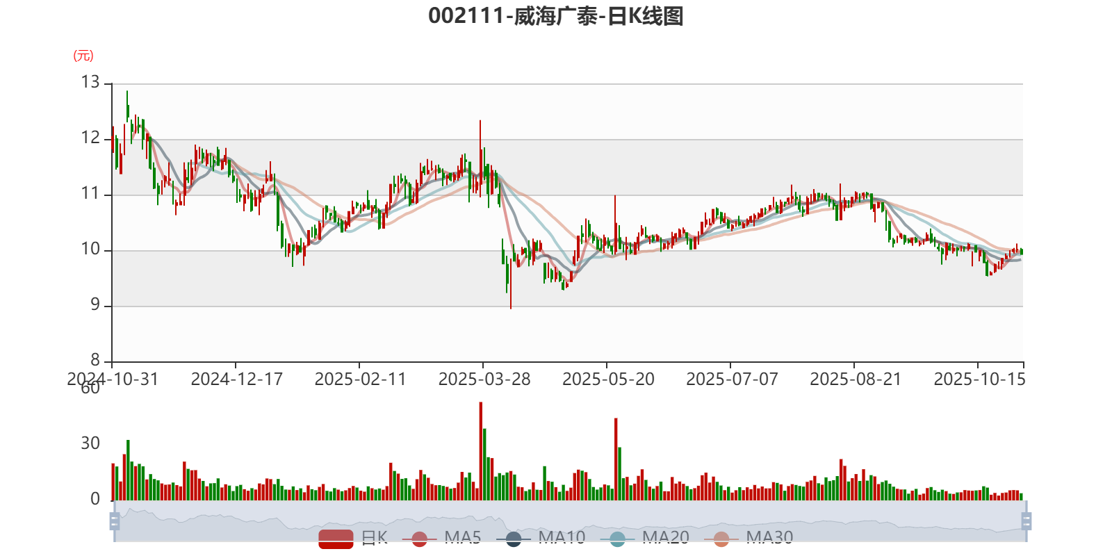 中证智能财讯威海广泰(002111)10月31日披露2025年第三季度报告。前三季度公司实现营业总收入22.97亿元,同比增长10.75%;归母净利润1.27亿元,同比下降1.67%;扣非净利润1.15亿元,同比下降8.27%;经营活动产生的现金流量净额为1.31亿元,上年同期为-6.71亿元;报告期内,威海广泰基本每股收益为0.2459元,加权平均净资产收益率为4.00%。
