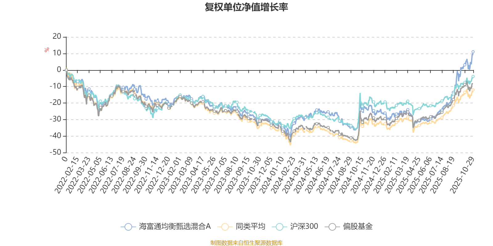 截至10月29日,海富通均衡甄选混合A近三个月复权单位净值增长率为38.07%,位于同类可比基金11/185;近半年复权单位净值增长率为61.27%,位于同类可比基金12/185;近一年复权单位净值增长率为45.44%,位于同类可比基金41/181;近三年复权单位净值增长率为41.78%,位于同类可比基金43/175。