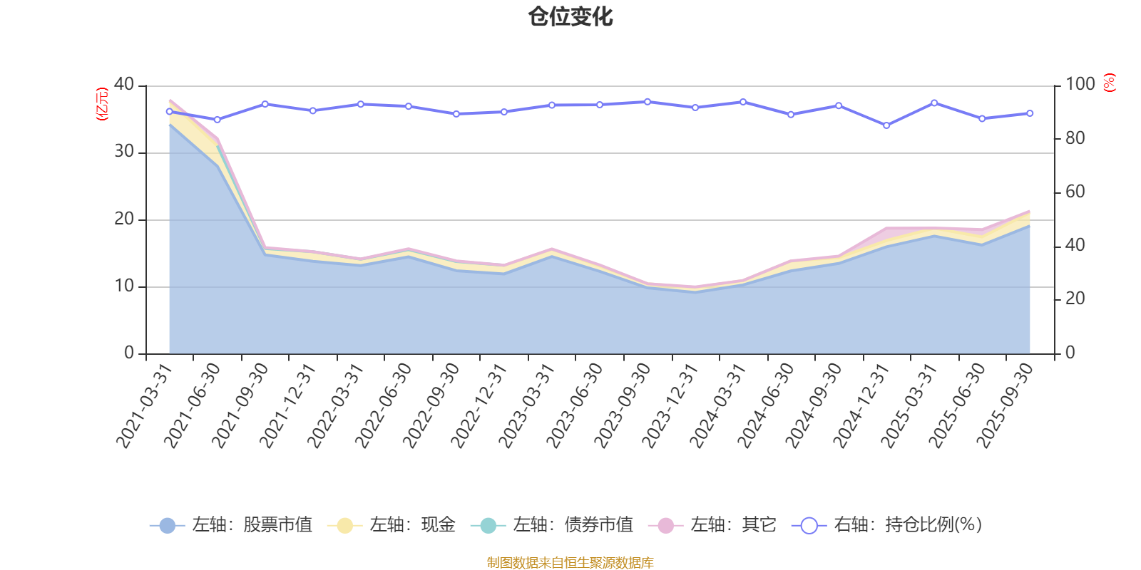 据定期报告数据统计,近三年平均股票仓位为91.08%,同类平均为87.62%。2023年三季度末基金达到93.95%的最高仓位,2024年末最低,为85.13%。