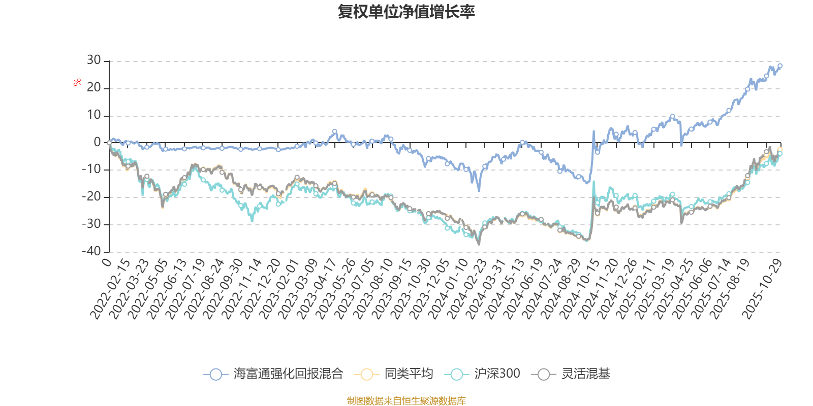 截至10月29日,海富通强化回报混合近三个月复权单位净值增长率为10.64%,位于同类可比基金712/1287;近半年复权单位净值增长率为22.44%,位于同类可比基金714/1287;近一年复权单位净值增长率为28.08%,位于同类可比基金543/1287;近三年复权单位净值增长率为31.43%,位于同类可比基金373/1286。