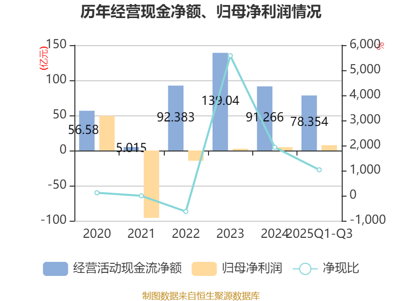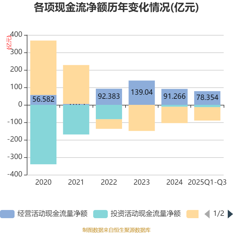 2025年前三季度,公司经营活动现金流净额为78.35亿元,同比下降5.3%;筹资活动现金流净额-76.83亿元,同比减少12.72亿元;投资活动现金流净额-13.11亿元,上年同期为-19.51亿元。