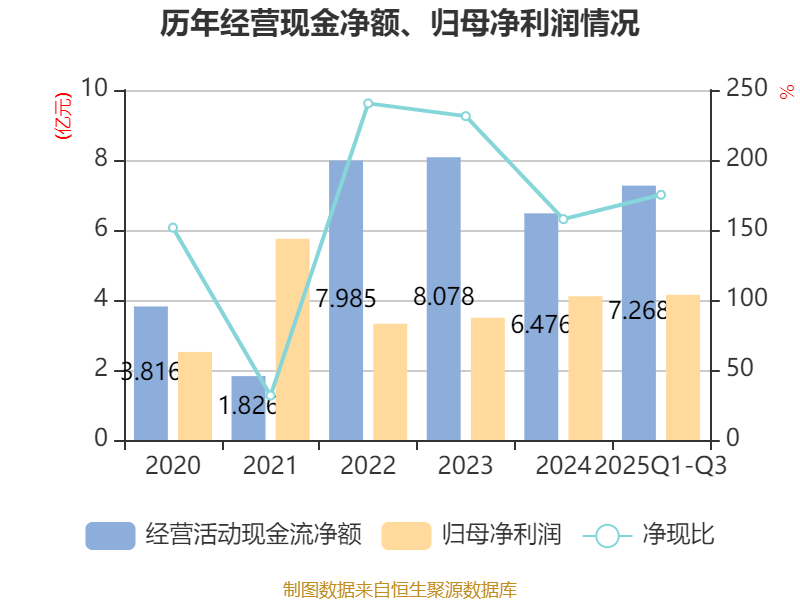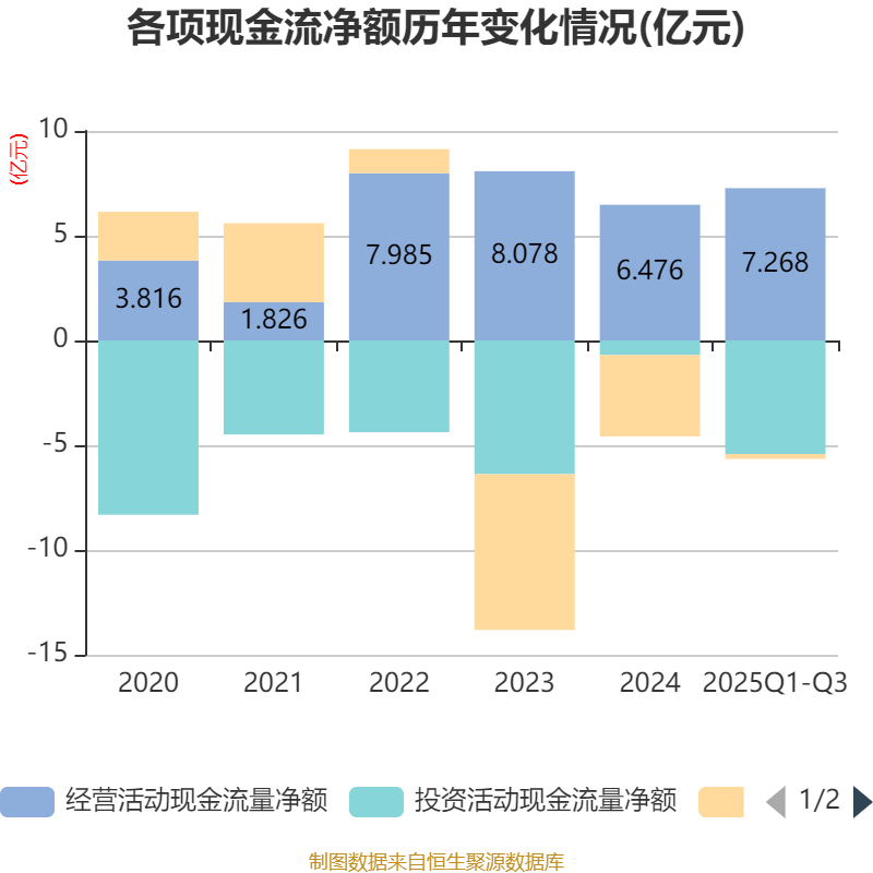 2025年前三季度,公司经营活动现金流净额为7.27亿元,同比增长44.15%;筹资活动现金流净额-2369.14万元,同比增加5.52亿元;投资活动现金流净额-5.42亿元,上年同期为2.54亿元。