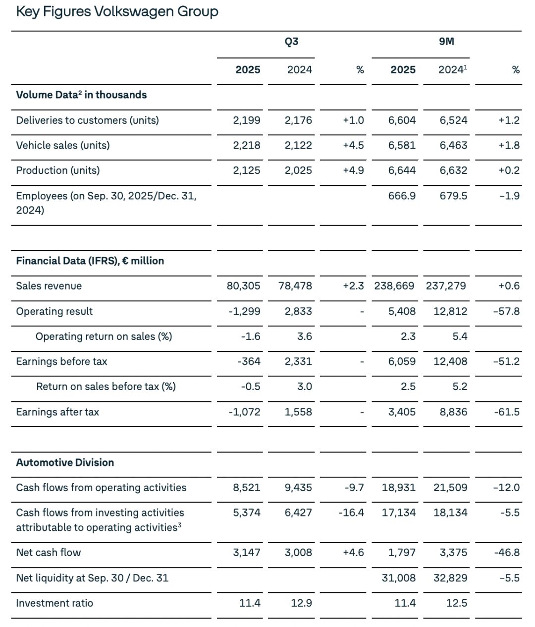 大众集团首席财务官阿诺·安特利茨表示,与上年同期相比,业绩明显走弱主要是受低利润率的电动车产量增加,以及合计75亿欧元的额外负担影响,其中包括美国进口关税、旗下品牌保时捷的产品战略调整和相关商誉及企业价值减记等。若剔除相关费用,集团前三季度利润率为5.4%。