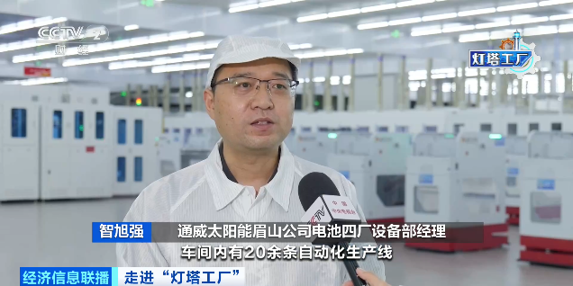 通威太阳能眉山公司电池四厂设备部经理智旭强:车间内有20余条自动化生产线,在数字化转型后,日产量从2024年的441万片,提升至目前的495万片,净增54万片每天。