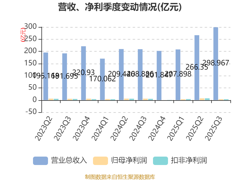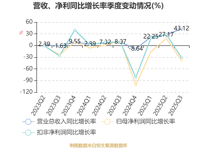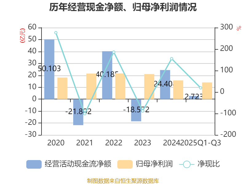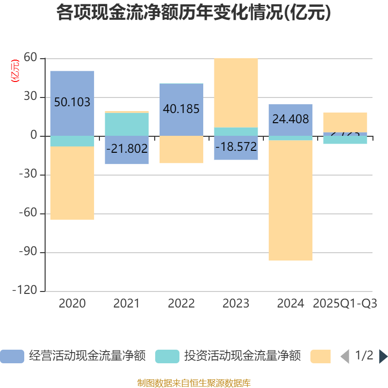 2025年前三季度,公司经营活动现金流净额为2.72亿元,同比增加26.72亿元;筹资活动现金流净额15.26亿元,同比增加65.41亿元;投资活动现金流净额-6.21亿元,上年同期为1883.74万元。