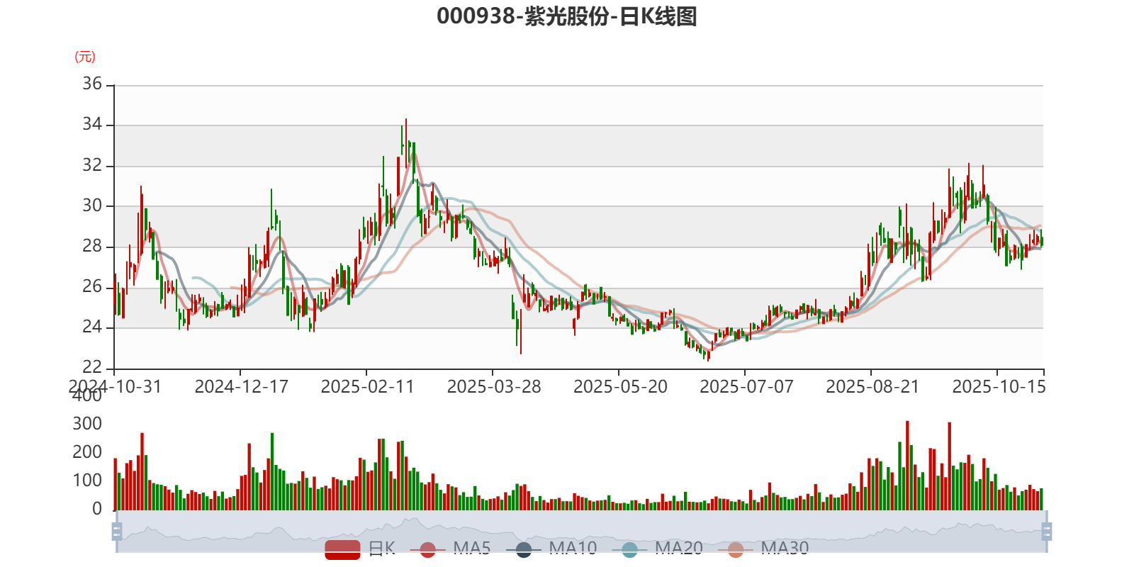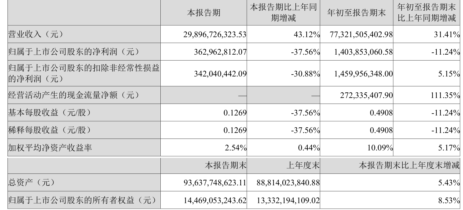 中证智能财讯紫光股份(000938)10月31日披露2025年第三季度报告。前三季度公司实现营业总收入773.22亿元,同比增长31.41%;归母净利润14.04亿元,同比下降11.24%;扣非净利润14.6亿元,同比增长5.15%;经营活动产生的现金流量净额为2.72亿元,上年同期为-24亿元;报告期内,紫光股份基本每股收益为0.4908元,加权平均净资产收益率为10.09%。