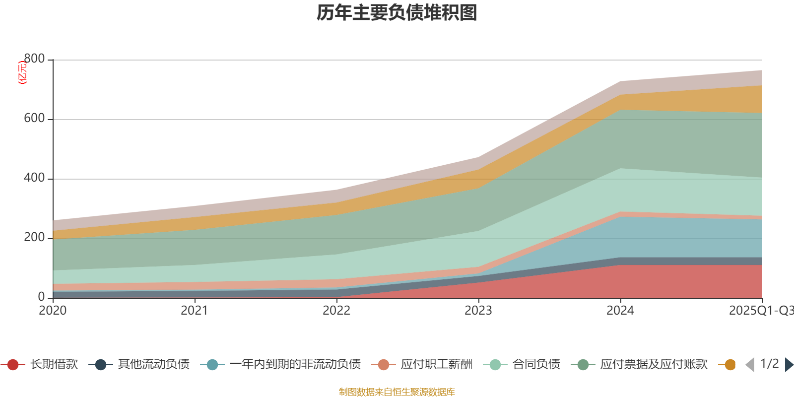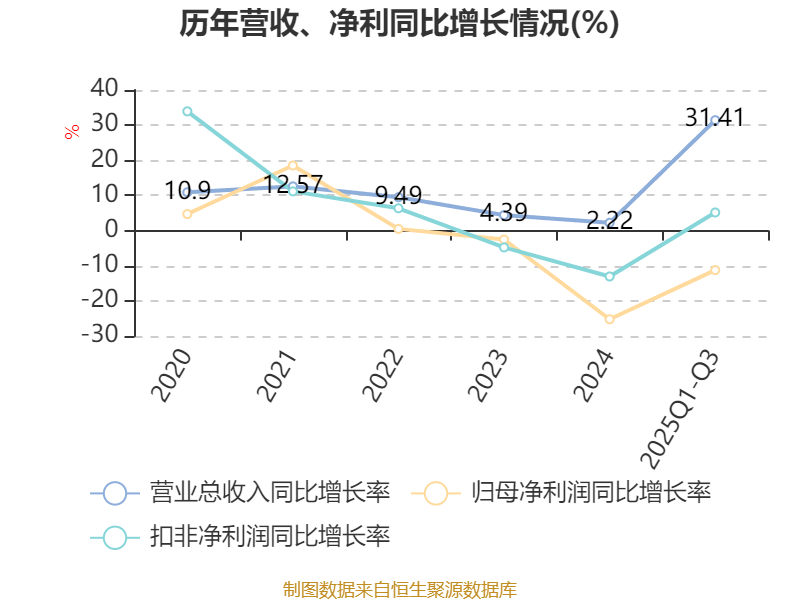 负债重大变化方面,截至2025年三季度末,公司短期借款较上年末增加83.52%,占公司总资产比重上升4.22个百分点;合同负债较上年末减少11.9%,占公司总资产比重下降2.68个百分点;一年内到期的非流动负债较上年末减少6.69%,占公司总资产比重下降1.76个百分点;应付票据及应付账款较上年末增加10.45%,占公司总资产比重上升1.05个百分点。
