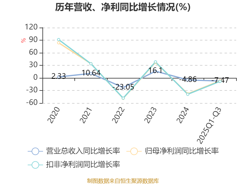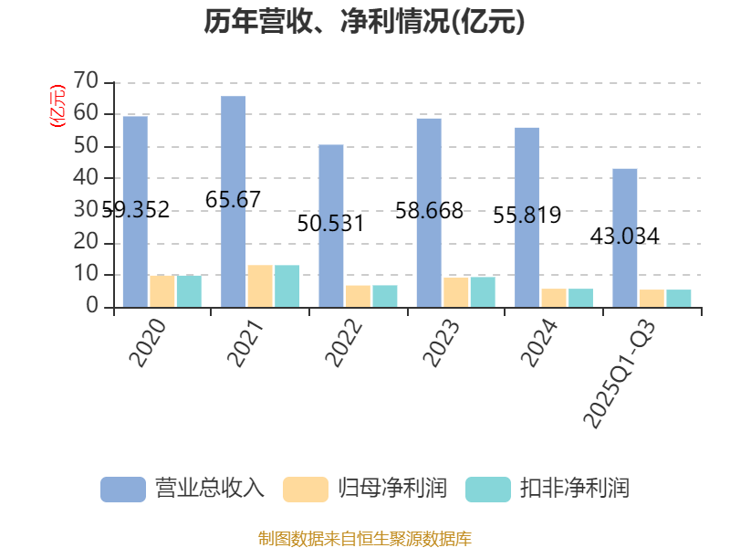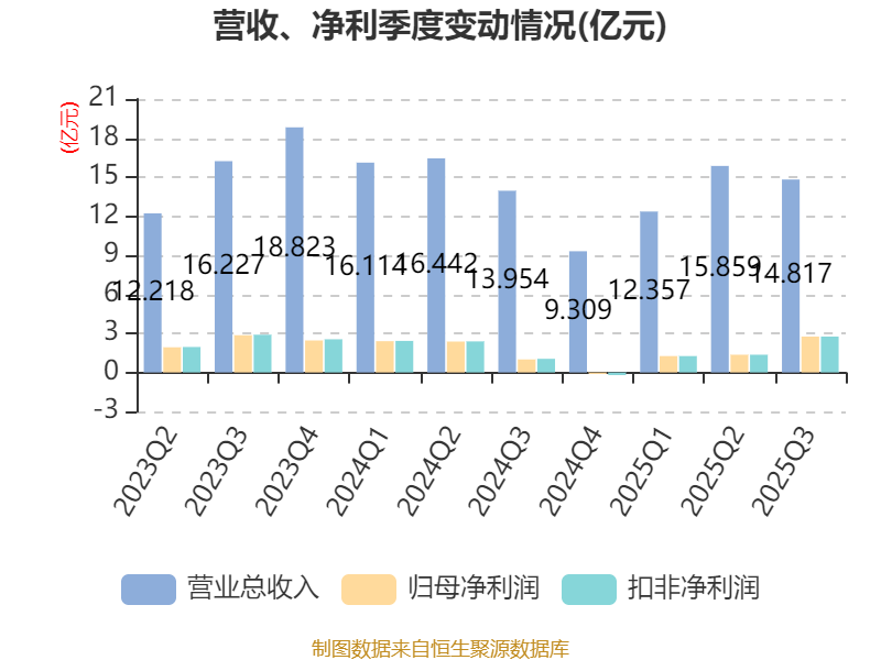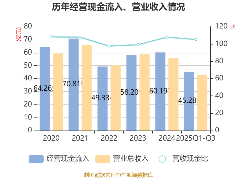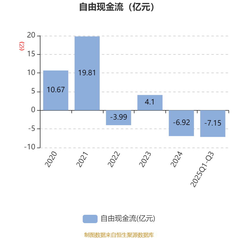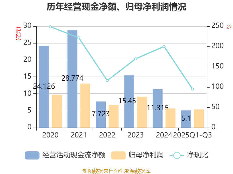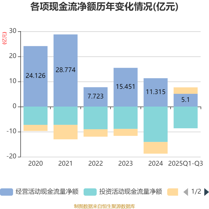 2025年前三季度,公司经营活动现金流净额为5.1亿元,同比下降41.57%;筹资活动现金流净额2.57亿元,同比增加6.59亿元;投资活动现金流净额-8.65亿元,上年同期为-10.24亿元。