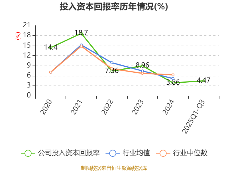 盈利能力方面, 2025年前三季度公司加权平均净资产收益率为5.4%,同比下降0.73个百分点。公司2025年前三季度投入资本回报率为4.47%,较上年同期下降0.5个百分点。