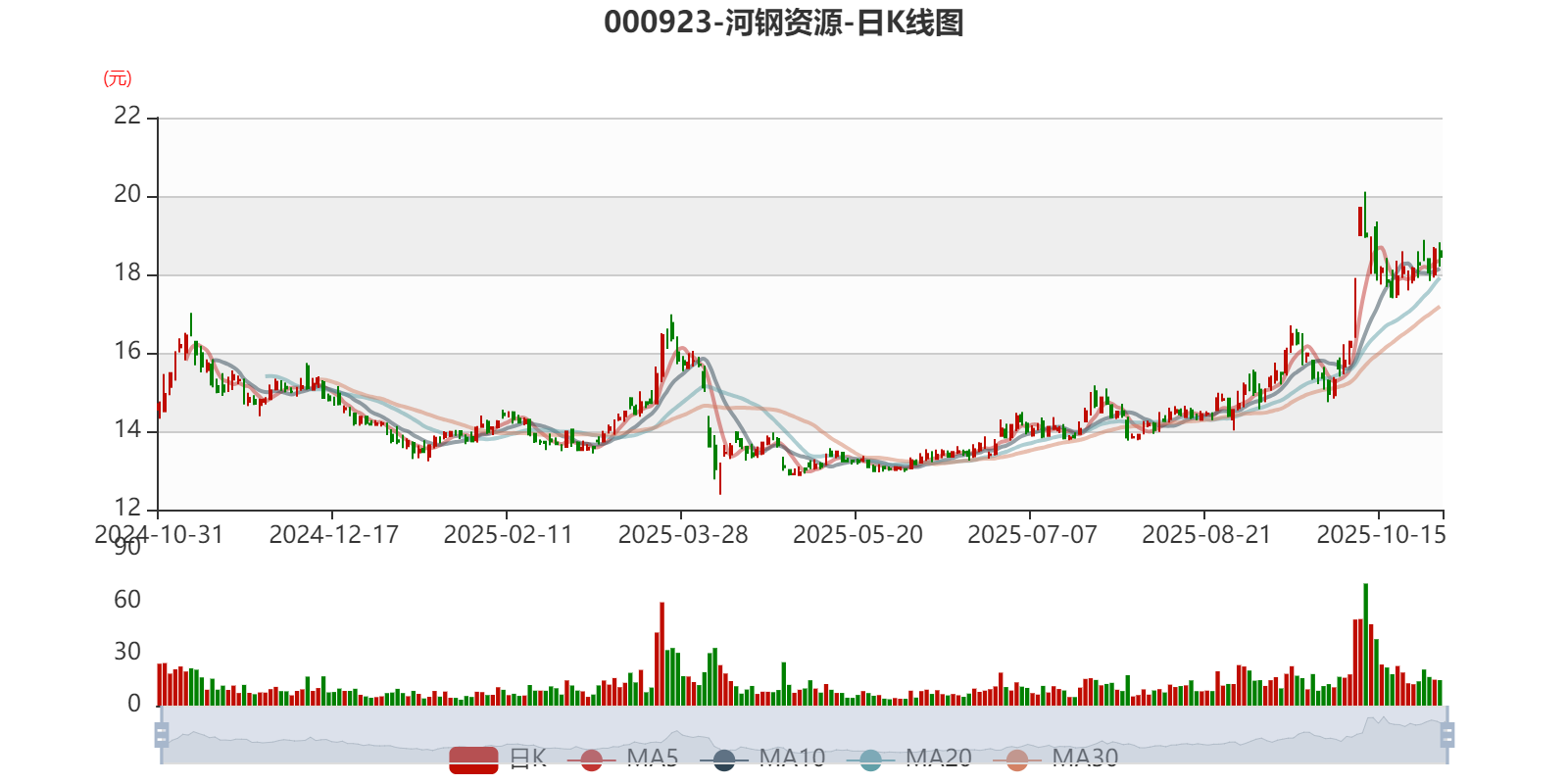 以10月30日收盘价计算,河钢资源目前市盈率(TTM)约为22.88倍,市净率(LF)约1.17倍,市销率(TTM)约2.3倍。