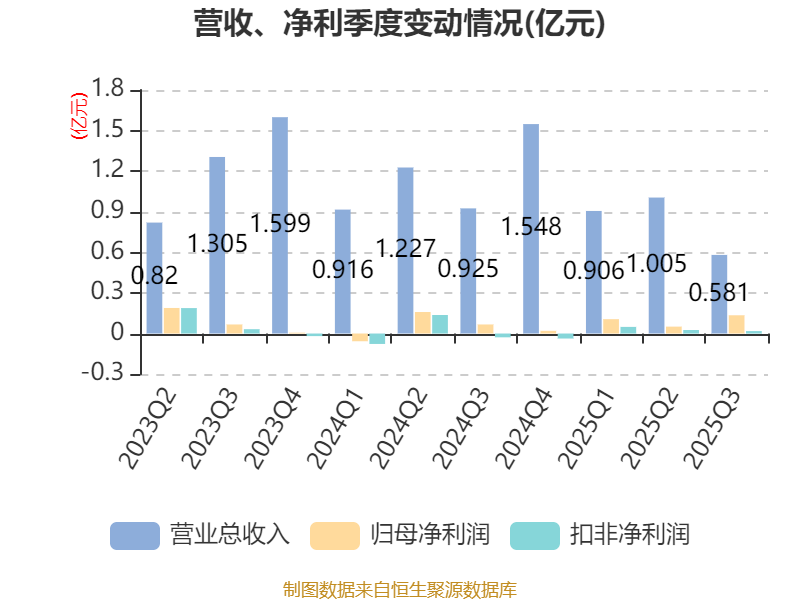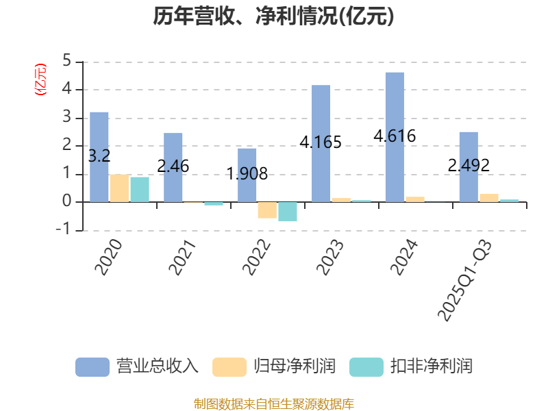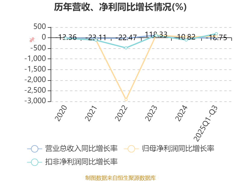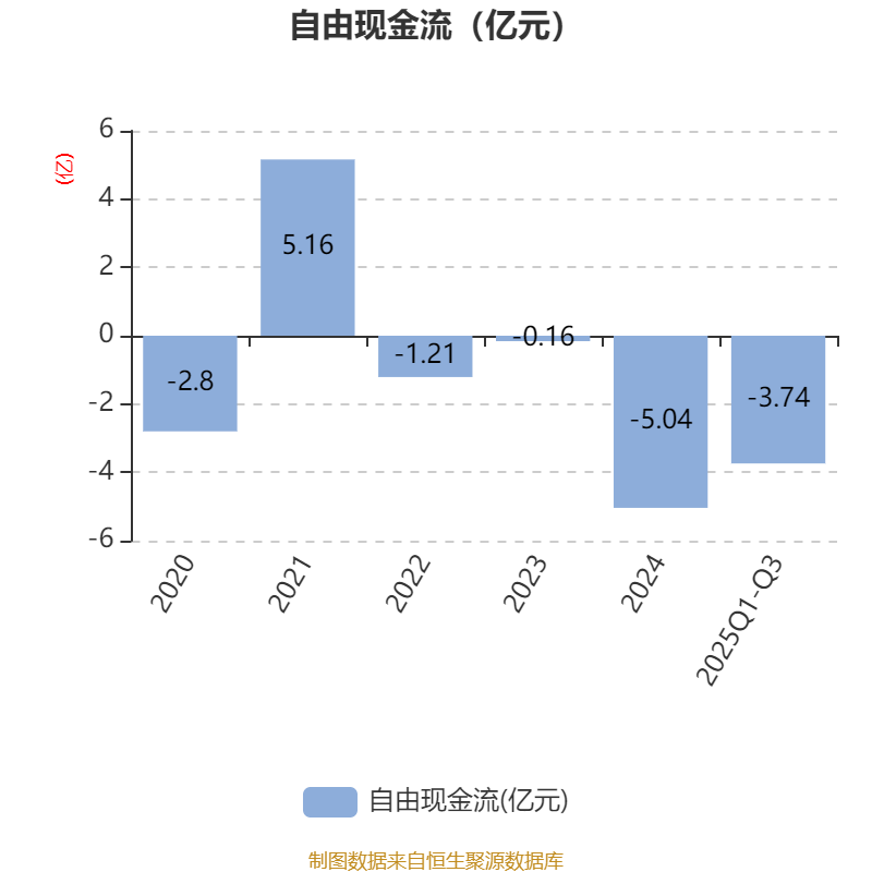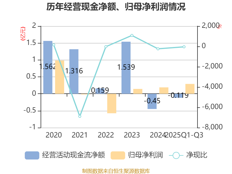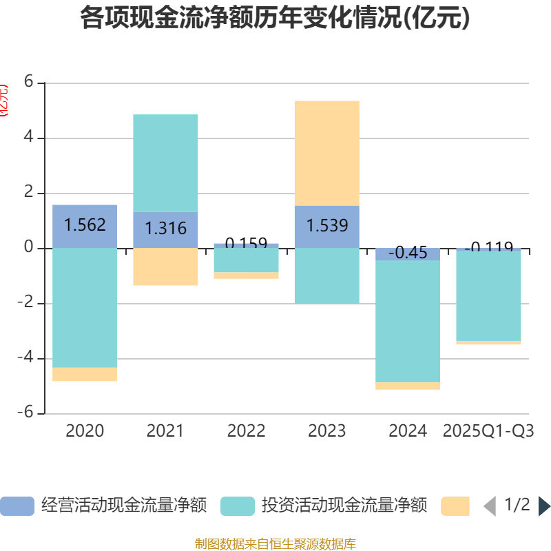 2025年前三季度,公司经营活动现金流净额为-1186.95万元,同比增加9725.5万元;筹资活动现金流净额-1223.71万元,同比增加237.87万元;投资活动现金流净额-3.26亿元,上年同期为-5.09亿元。