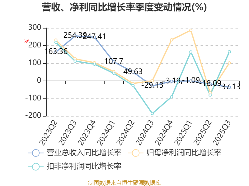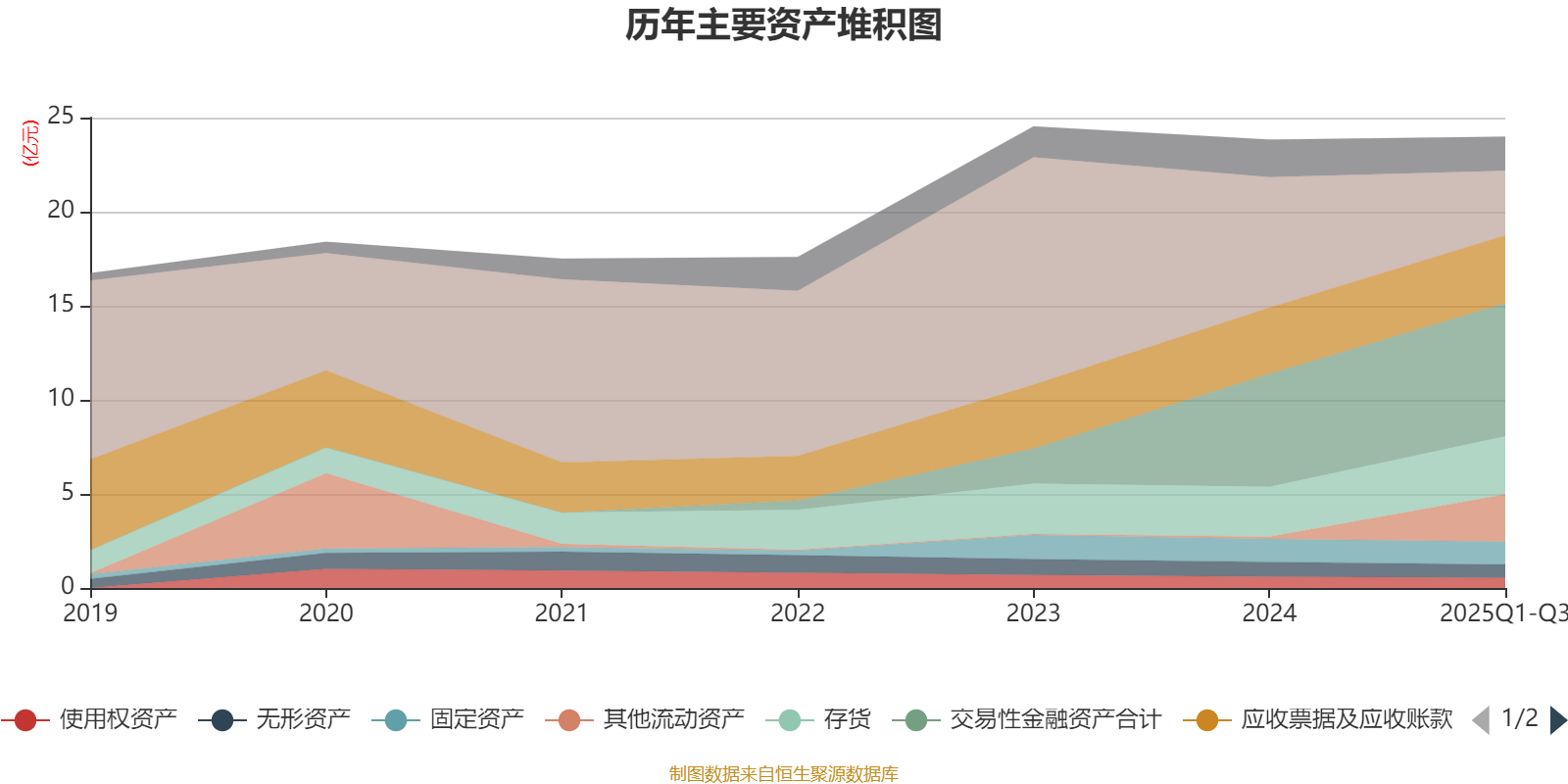 资产重大变化方面,截至2025年三季度末,公司货币资金较上年末减少50.54%,占公司总资产比重下降14.82个百分点;其他流动资产较上年末增加1994.44%,占公司总资产比重上升9.99个百分点;交易性金融资产合计较上年末增加17.59%,占公司总资产比重上升4.24个百分点;存货较上年末增加16.55%,占公司总资产比重上升1.76个百分点。
