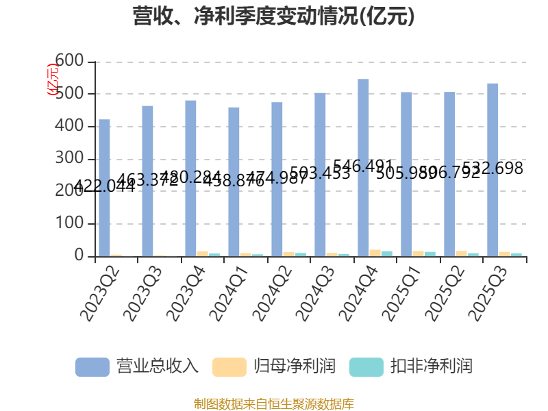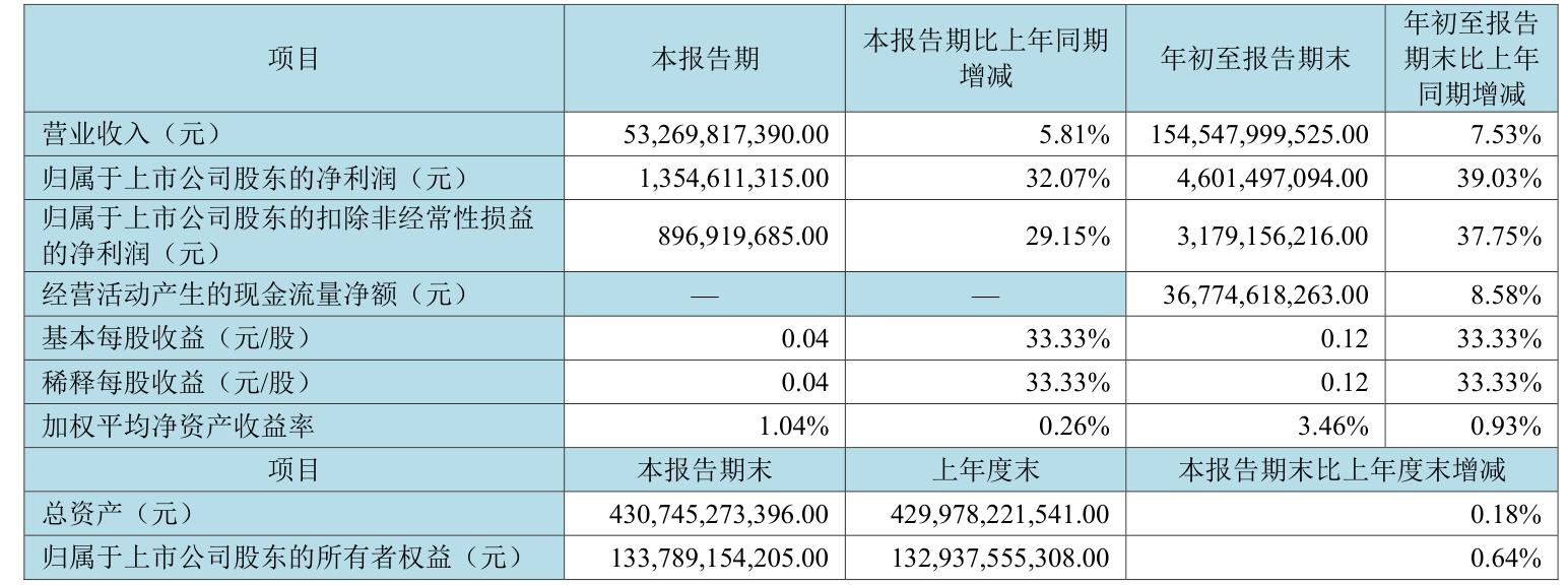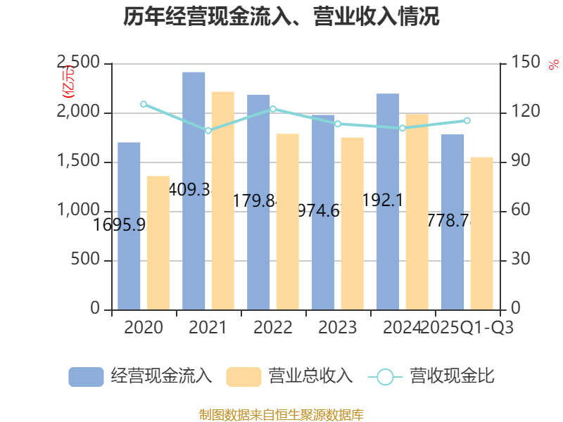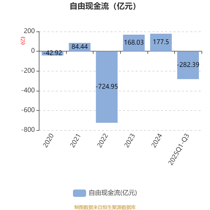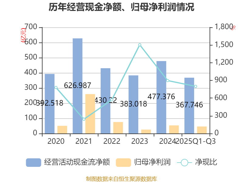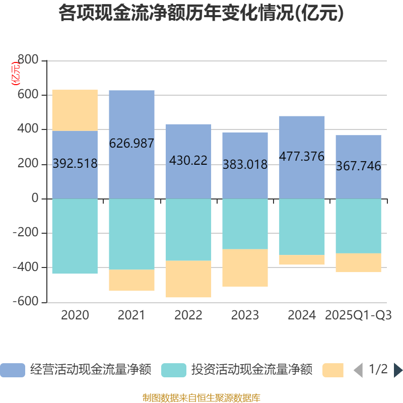2025年前三季度,公司经营活动现金流净额为367.75亿元,同比增长8.58%;筹资活动现金流净额-108.45亿元,同比减少26.27亿元;投资活动现金流净额-316.74亿元,上年同期为-229.61亿元。