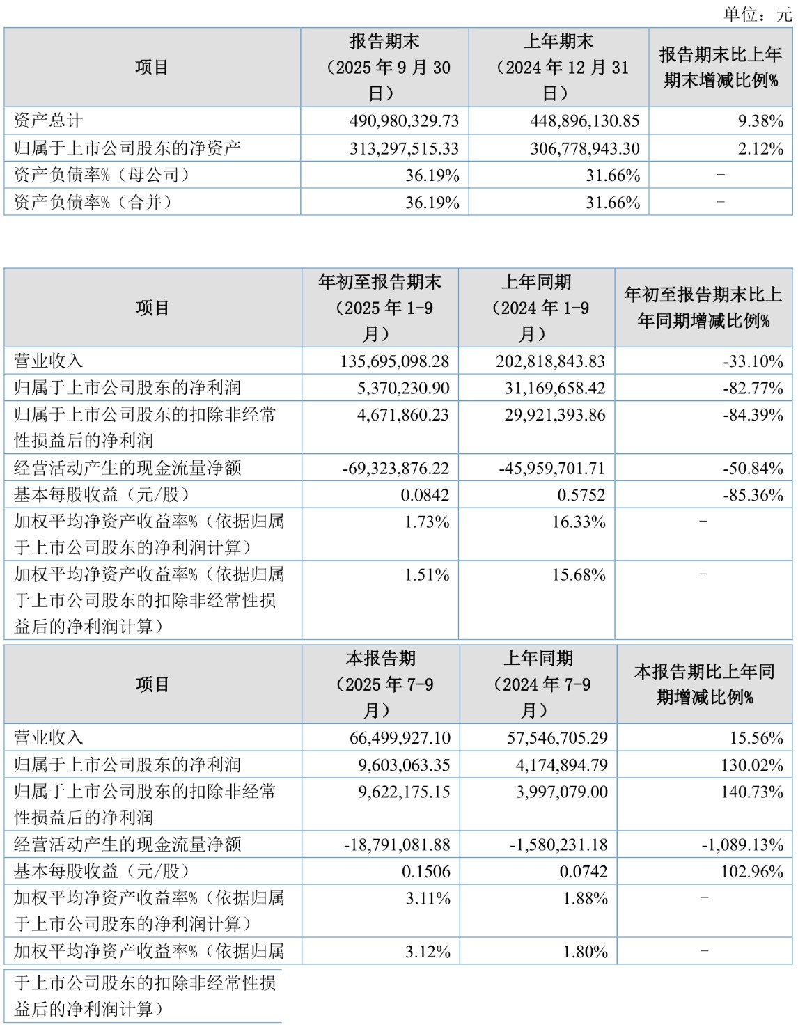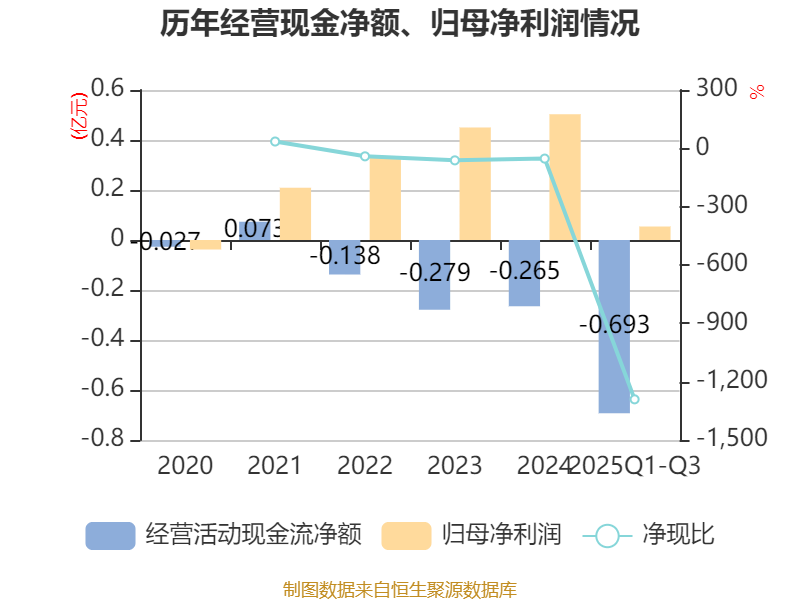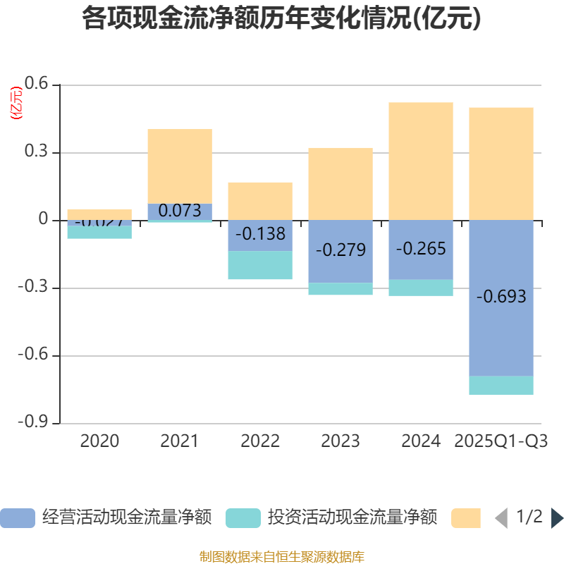 2025年前三季度,公司经营活动现金流净额为-6932.39万元,同比减少2336.42万元;筹资活动现金流净额4980.17万元,同比减少3826.14万元;投资活动现金流净额-823.2万元,上年同期为-354.37万元。