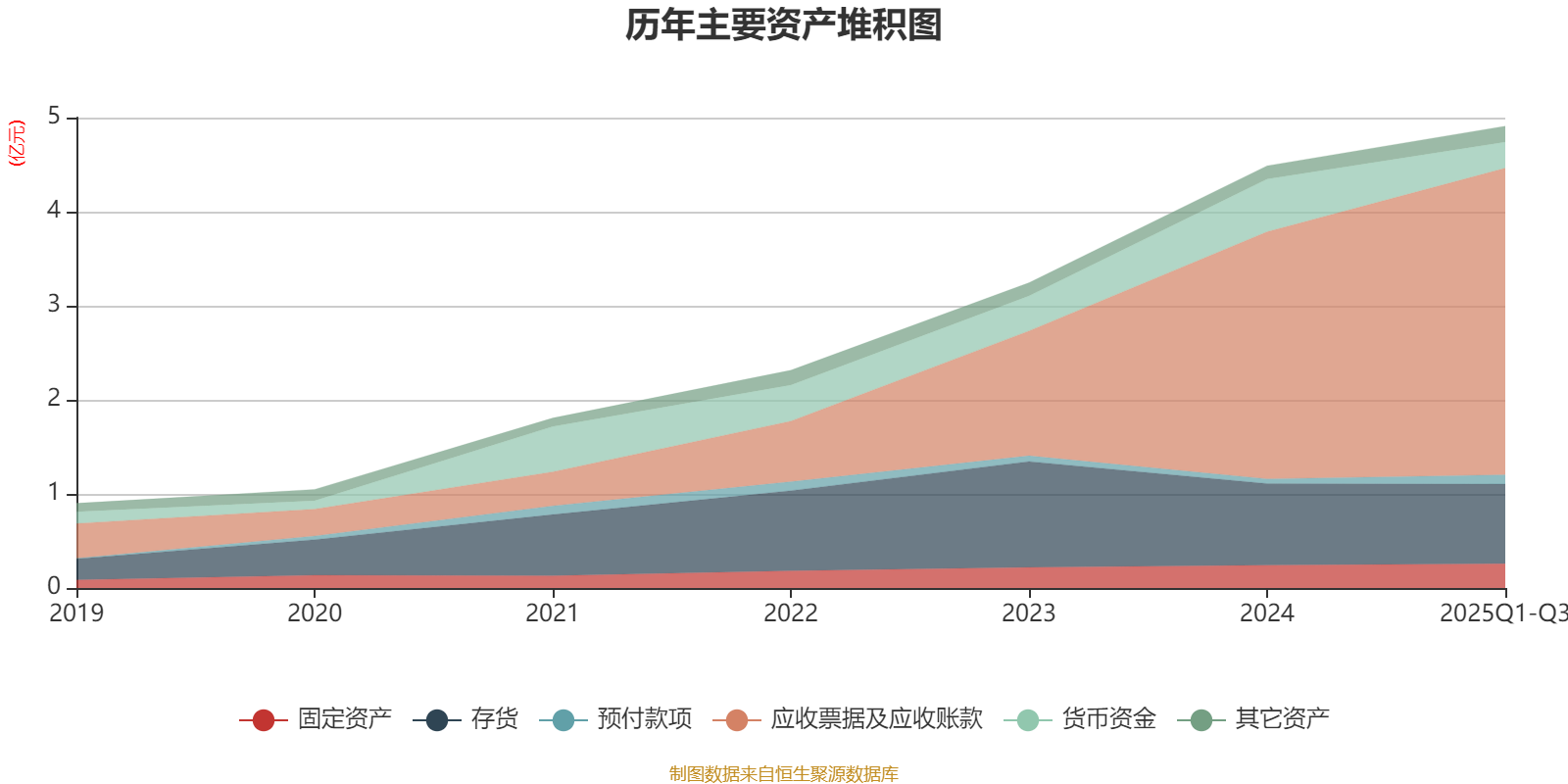 资产重大变化方面,截至2025年三季度末,公司应收票据及应收账款较上年末增加24.03%,占公司总资产比重上升7.84个百分点;货币资金较上年末减少50.59%,占公司总资产比重下降6.83个百分点;存货较上年末减少2.53%,占公司总资产比重下降2.1个百分点;预付款项较上年末增加94.25%,占公司总资产比重上升0.89个百分点。