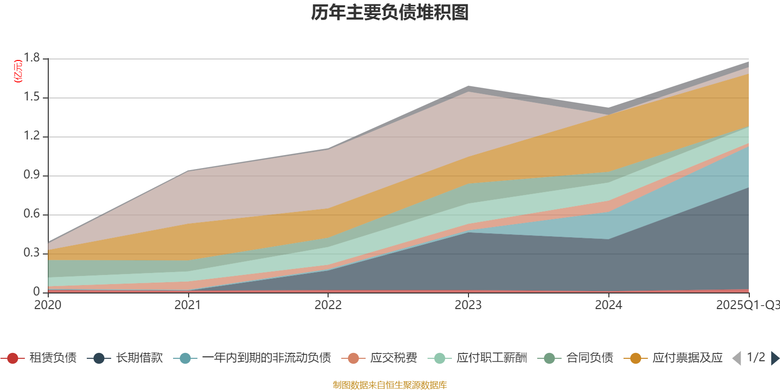 负债重大变化方面,截至2025年三季度末,公司长期借款较上年末增加95.75%,占公司总资产比重上升7.04个百分点;一年内到期的非流动负债较上年末增加50.35%,占公司总资产比重上升1.76个百分点;合同负债较上年末减少90.29%,占公司总资产比重下降1.67个百分点;应付票据及应付账款较上年末减少8%,占公司总资产比重下降1.55个百分点。
