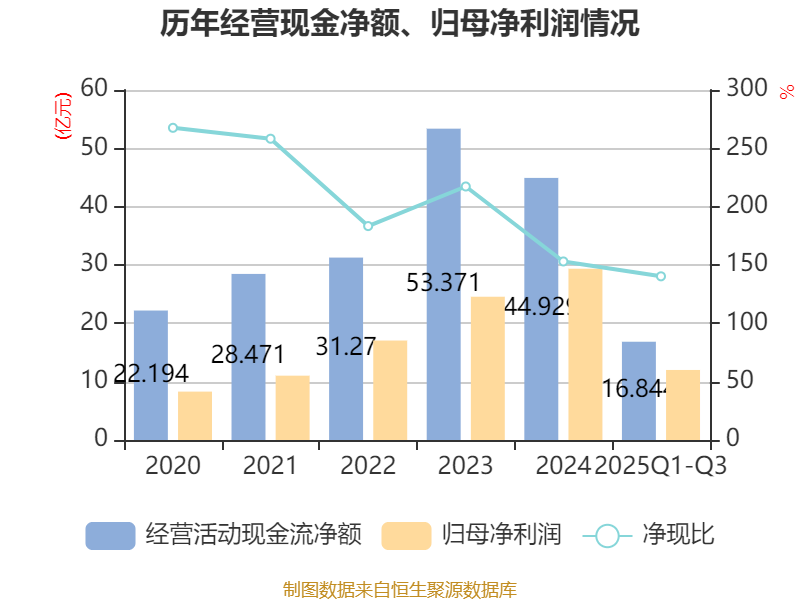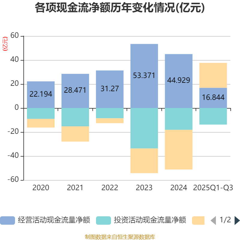 2025年前三季度,公司经营活动现金流净额为16.84亿元,同比下降48.57%;筹资活动现金流净额20.77亿元,同比增加34.46亿元;投资活动现金流净额-13.83亿元,上年同期为-13.9亿元。