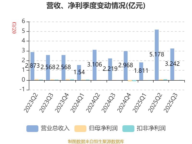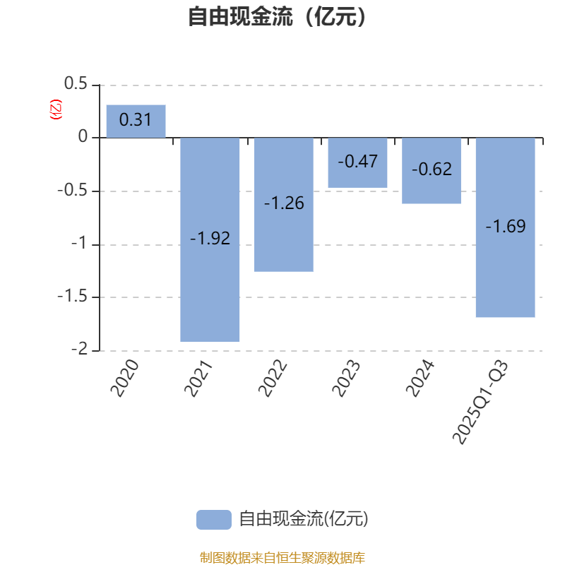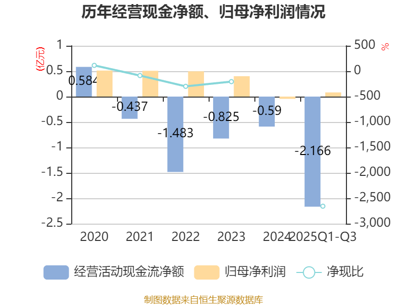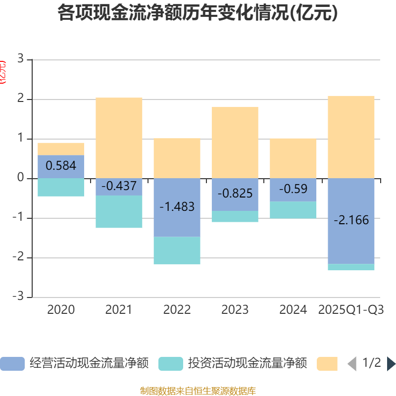 2025年前三季度,公司经营活动现金流净额为-2.17亿元,同比减少1.69亿元;筹资活动现金流净额2.08亿元,同比增加1.86亿元;投资活动现金流净额-1592.96万元,上年同期为-1758.12万元。