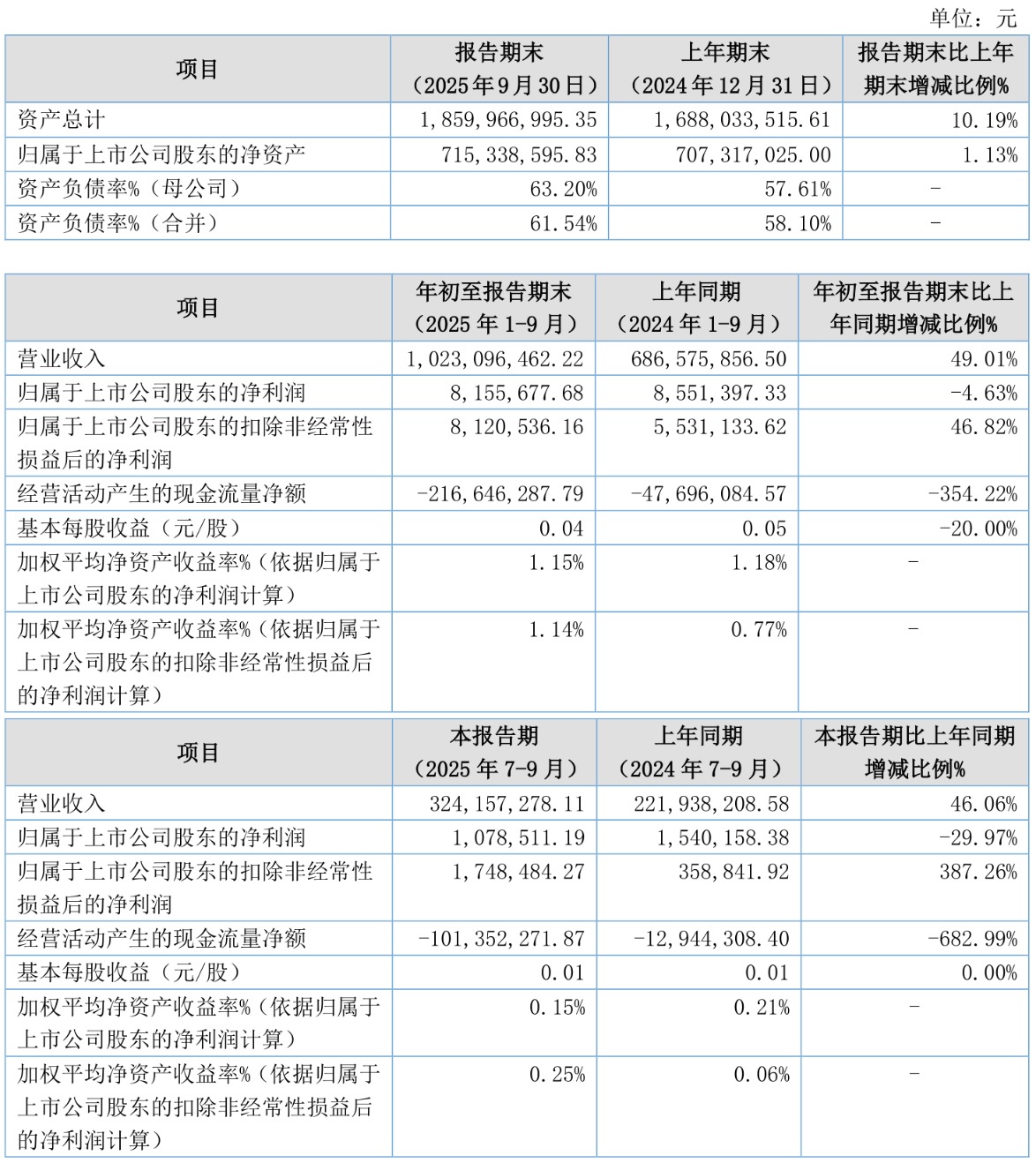 中证智能财讯百甲科技(920057)10月30日披露2025年第三季度报告。前三季度公司实现营业总收入10.23亿元,同比增长49.01%;归母净利润815.57万元,同比下降4.63%;扣非净利润812.05万元,同比增长46.82%;经营活动产生的现金流量净额为-2.17亿元,上年同期为-4769.61万元;报告期内,百甲科技基本每股收益为0.04元,加权平均净资产收益率为1.15%。
