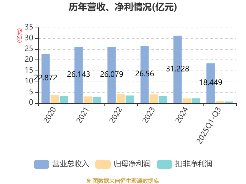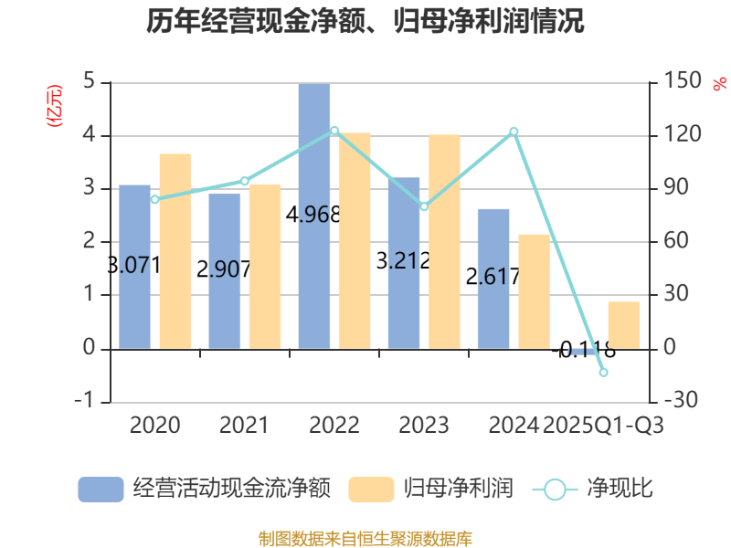 2025年前三季度,公司经营活动现金流净额为-1184.17万元,同比增加988.18万元;筹资活动现金流净额5830.49万元,同比减少2.58亿元;投资活动现金流净额-2.96亿元,上年同期为-3.05亿元。