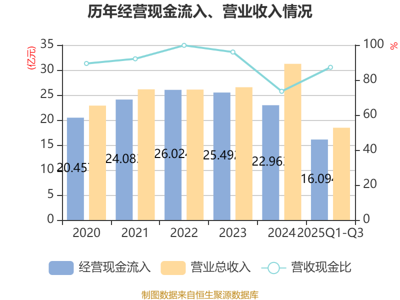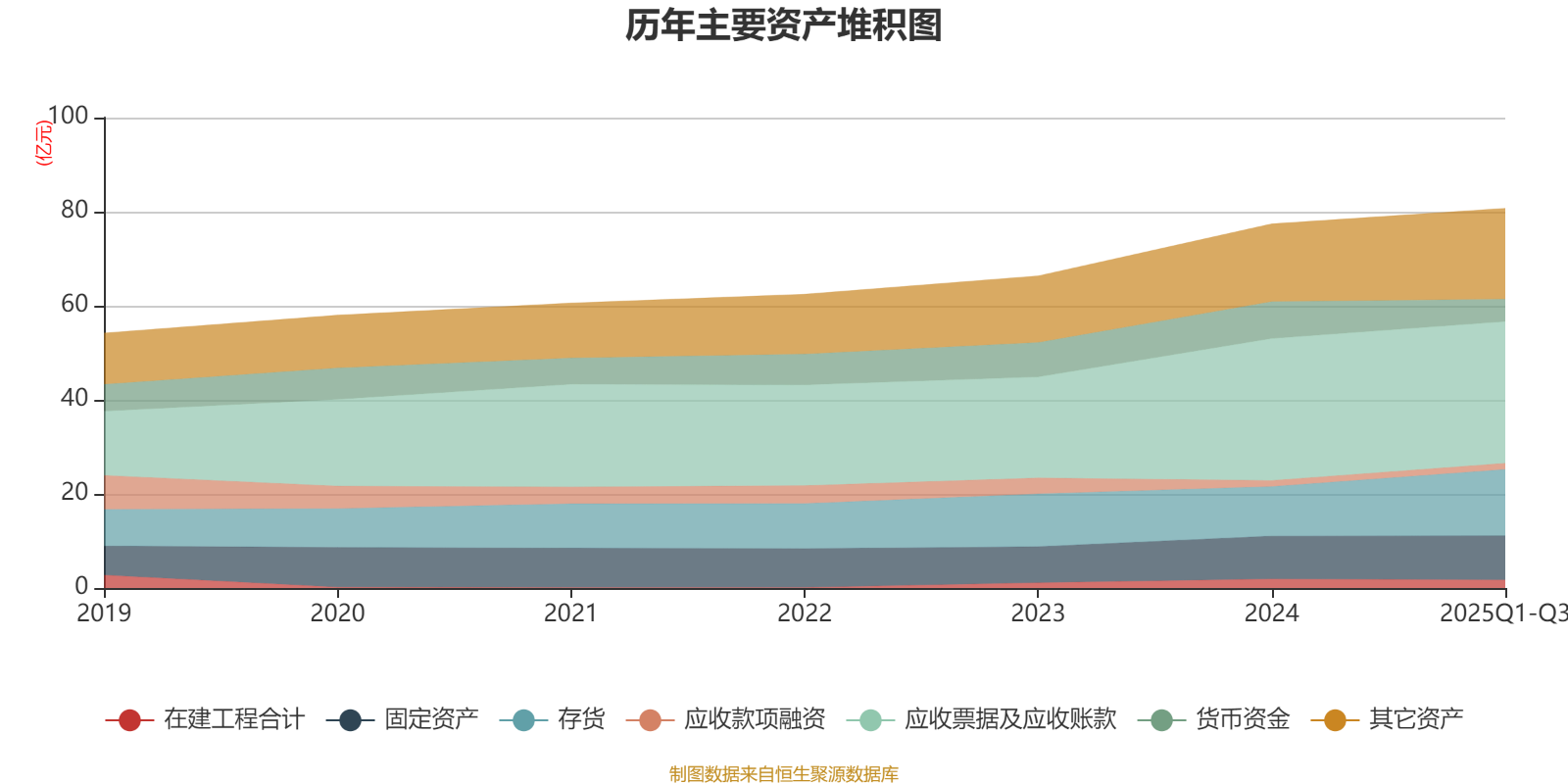 资产重大变化方面,截至2025年三季度末,公司货币资金较上年末减少39.34%,占公司总资产比重下降4.25个百分点;存货较上年末增加33.74%,占公司总资产比重上升3.84个百分点;应收票据及应收账款较上年末减少0.13%,占公司总资产比重下降1.65个百分点;长期应收款较上年末增加32.9%,占公司总资产比重上升0.82个百分点。