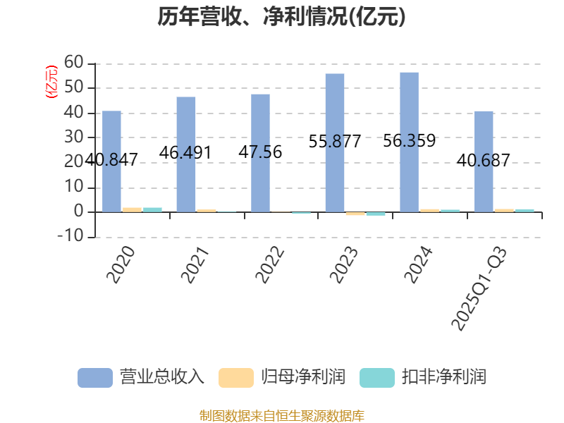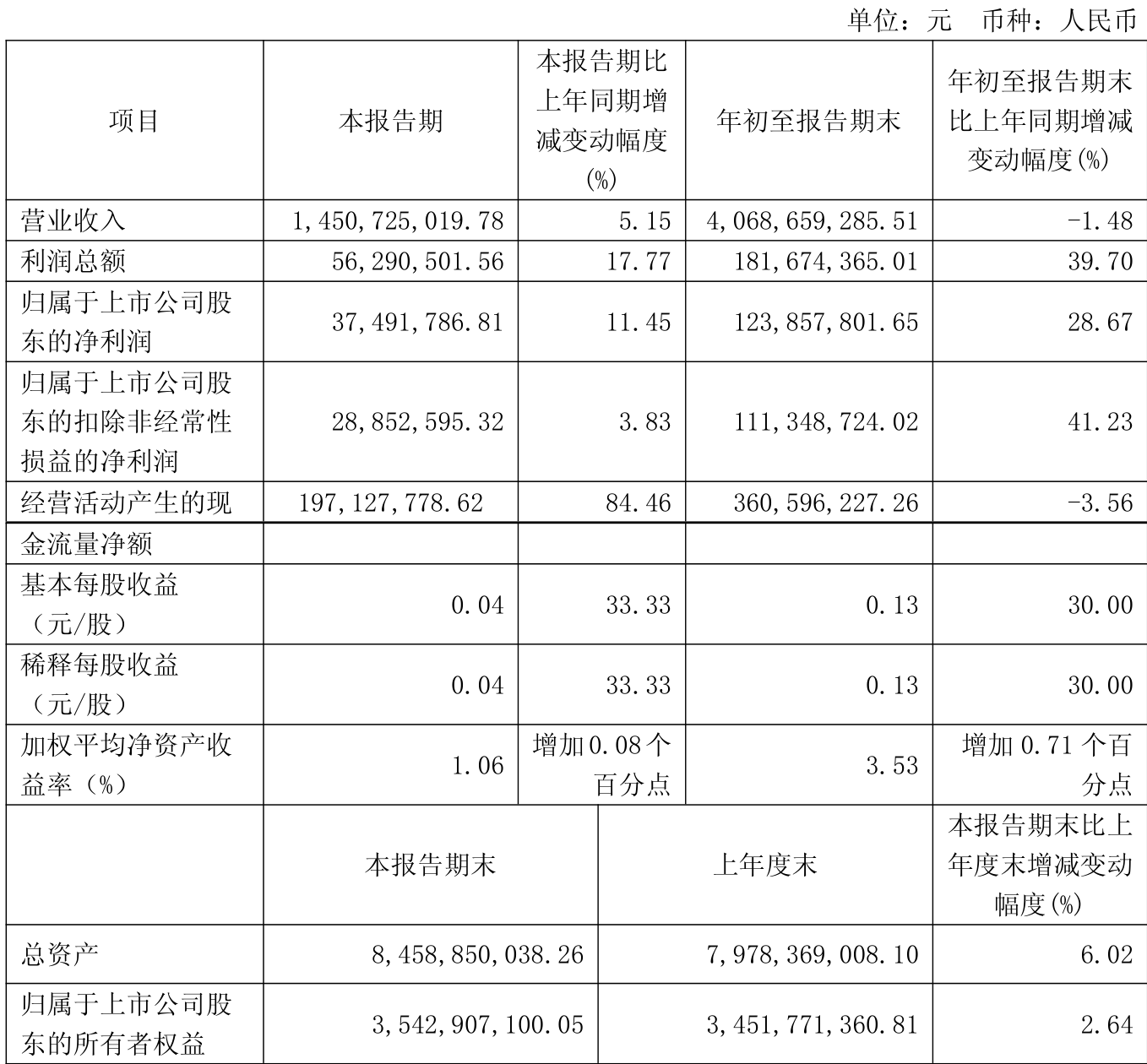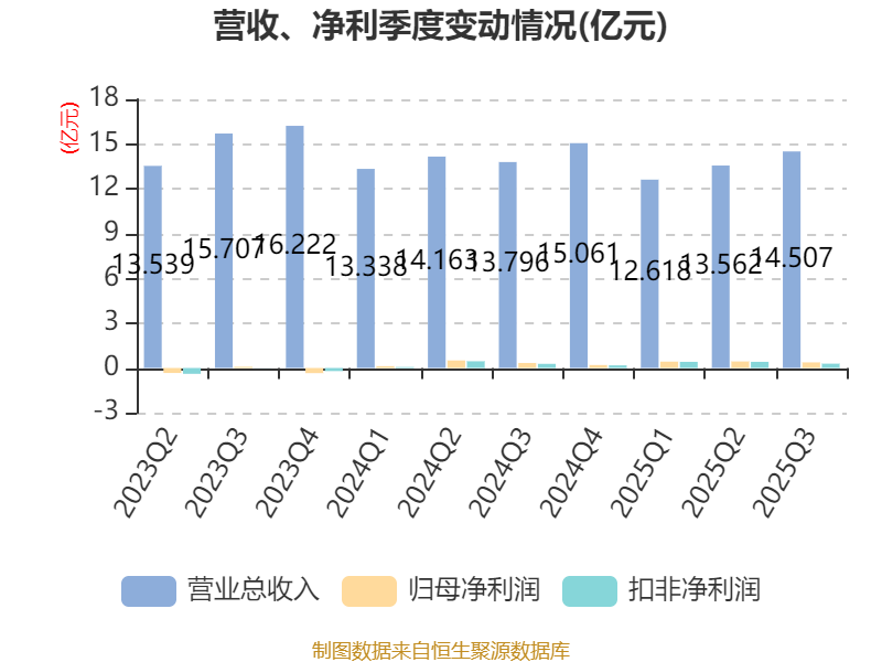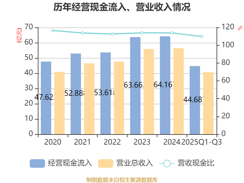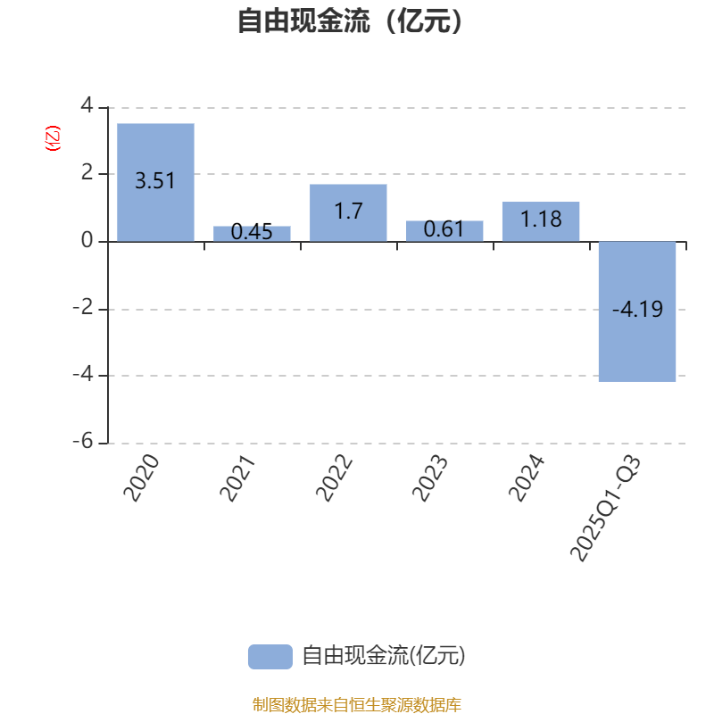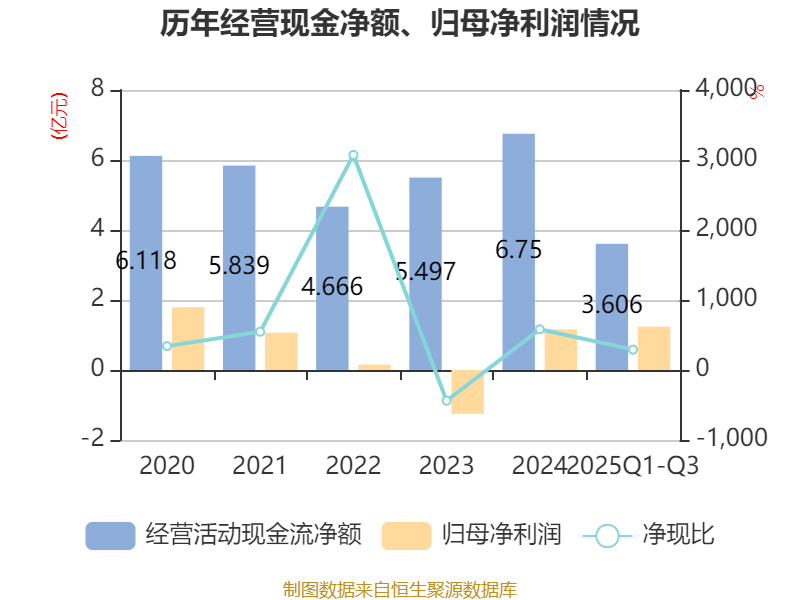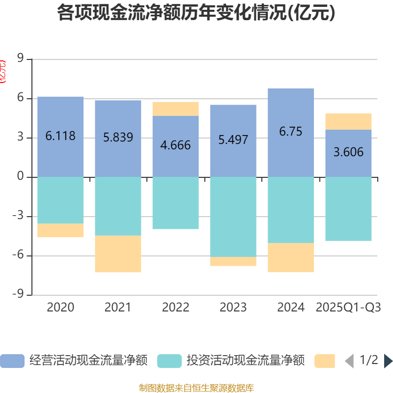 2025年前三季度,公司经营活动现金流净额为3.61亿元,同比下降3.56%;筹资活动现金流净额1.23亿元,同比增加2.34亿元;投资活动现金流净额-4.89亿元,上年同期为-1.94亿元。