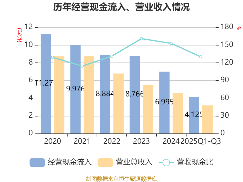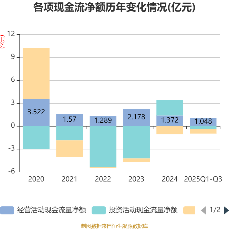 2025年前三季度,公司经营活动现金流净额为1.05亿元,同比下降12.1%;筹资活动现金流净额-6204.22万元,同比增加3271.5万元;投资活动现金流净额-3802.55万元,上年同期为-8826.19万元。