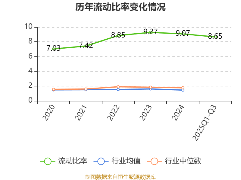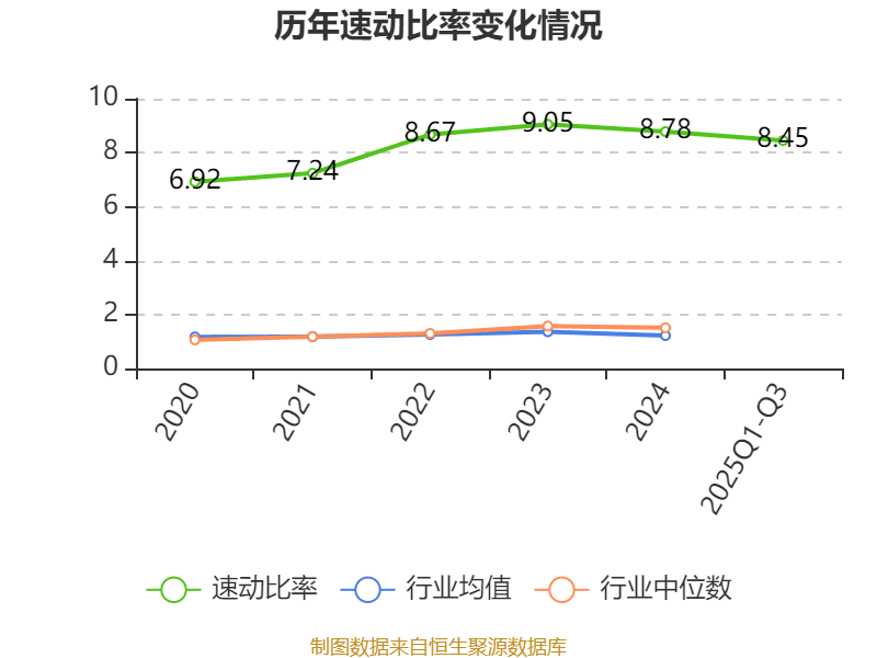 2025年前三季度,公司流动比率为8.65,速动比率为8.45。