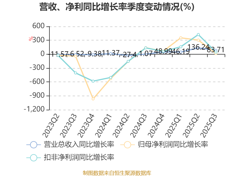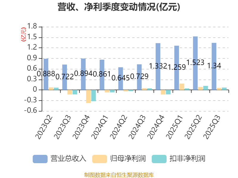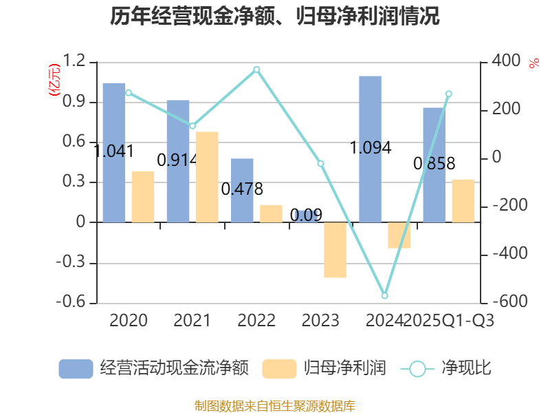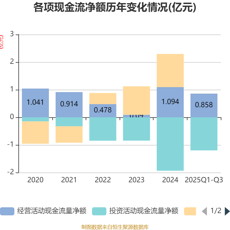 2025年前三季度,公司经营活动现金流净额为8581.31万元,同比增长59.55%;筹资活动现金流净额34.78万元,同比减少1.06亿元;投资活动现金流净额-1.2亿元,上年同期为-1.71亿元。