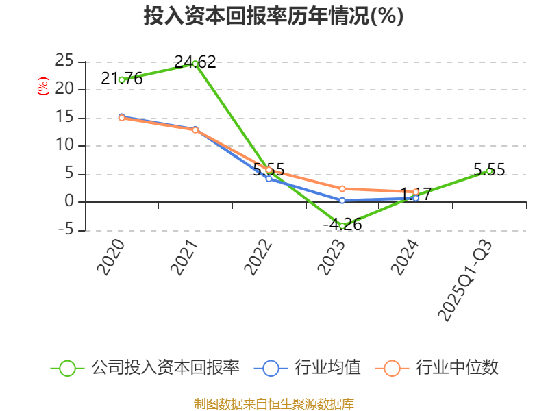 盈利能力方面, 2025年前三季度公司加权平均净资产收益率为13.48%,同比上升16.27个百分点。公司2025年前三季度投入资本回报率为5.55%,较上年同期上升4.64个百分点。