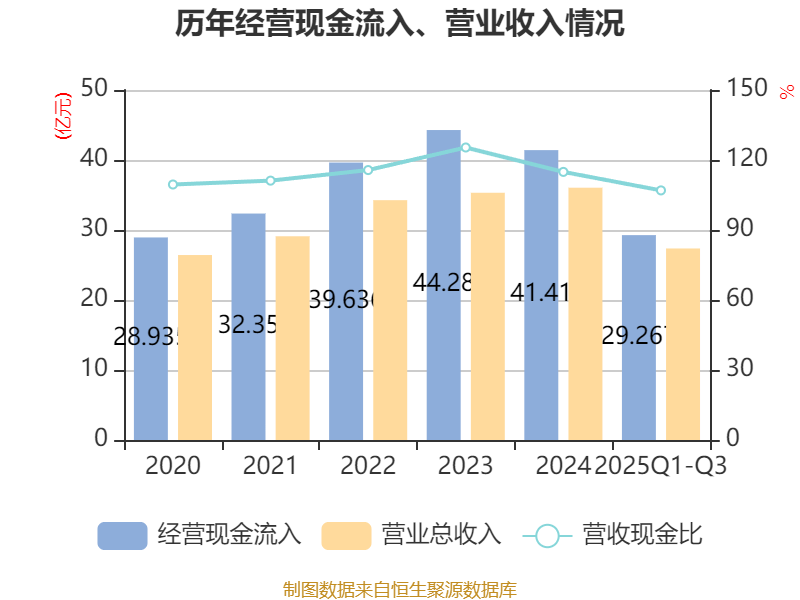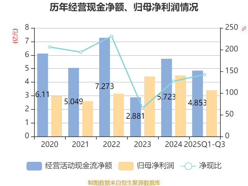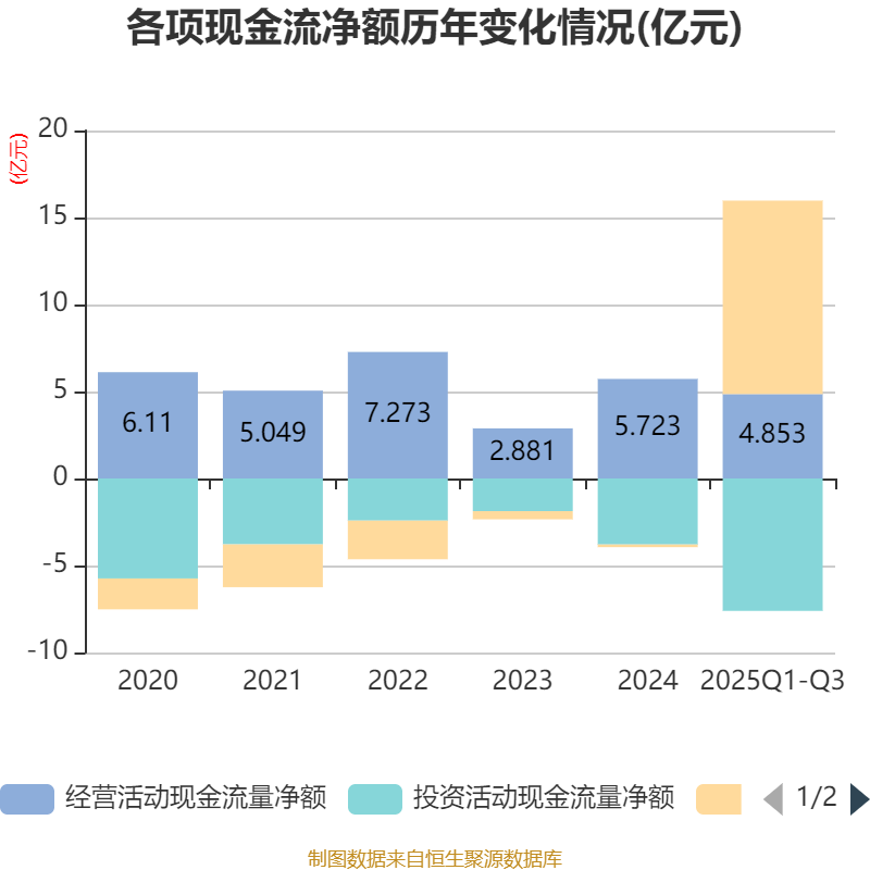 2025年前三季度,公司经营活动现金流净额为4.85亿元,同比增长63.33%;筹资活动现金流净额11.12亿元,同比增加11.26亿元;投资活动现金流净额-7.61亿元,上年同期为-2.57亿元。