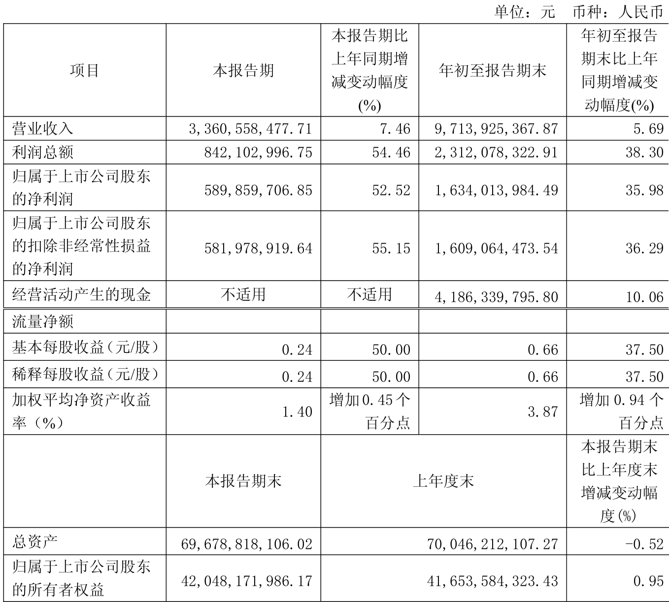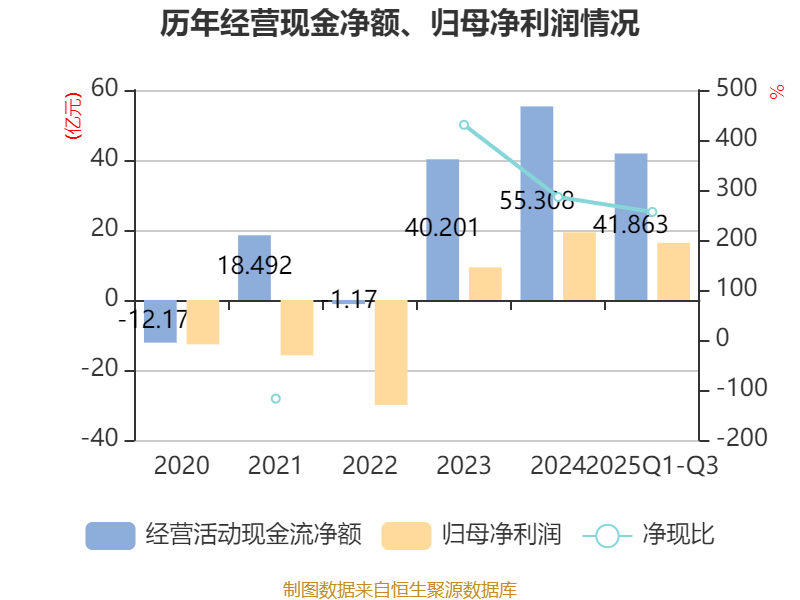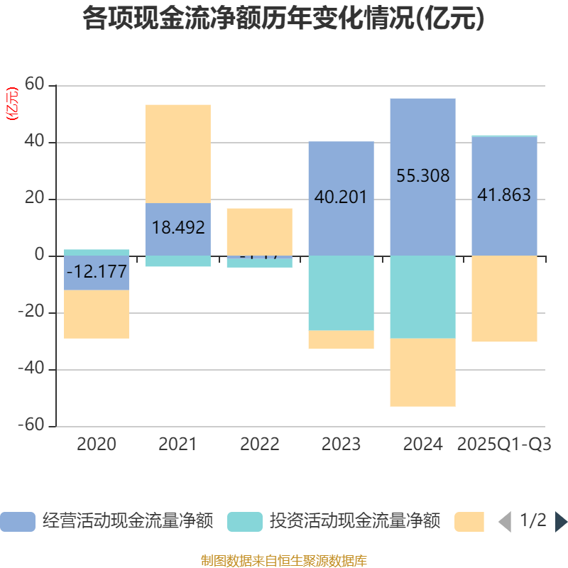 2025年前三季度,公司经营活动现金流净额为41.86亿元,同比增长10.06%;筹资活动现金流净额-30.29亿元,同比减少9.11亿元;投资活动现金流净额4360.32万元,上年同期为-14.19亿元。