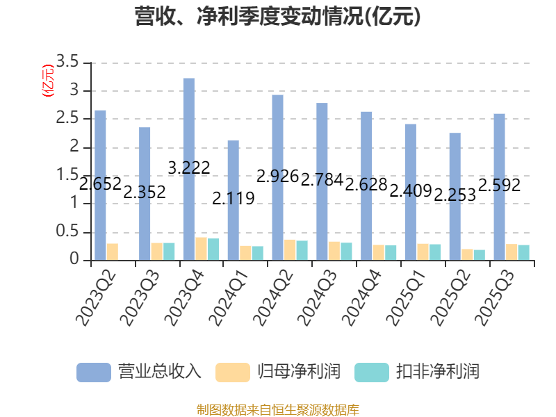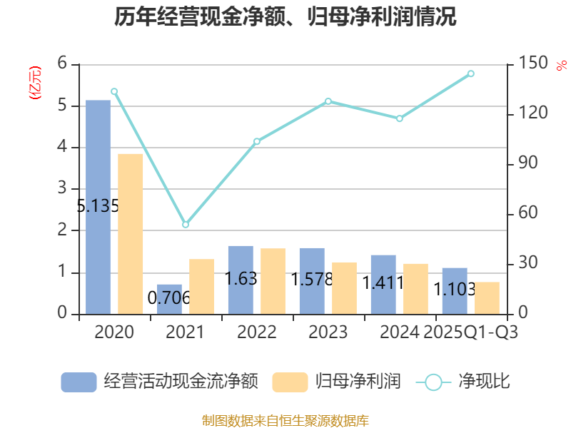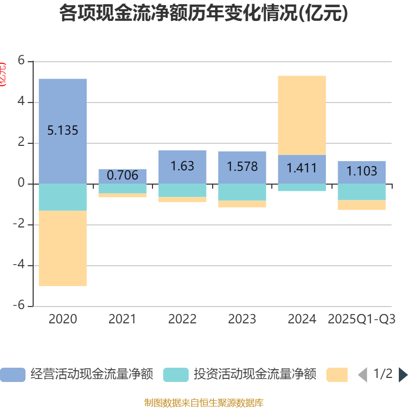 2025年前三季度,公司经营活动现金流净额为1.1亿元,同比下降2.09%;筹资活动现金流净额-4753.54万元,同比减少4429.89万元;投资活动现金流净额-8138.55万元,上年同期为-1.79亿元。