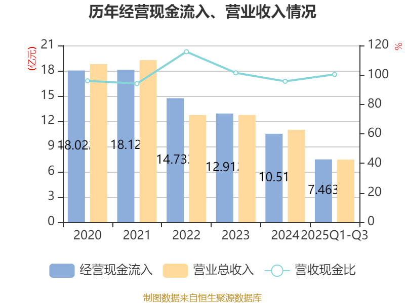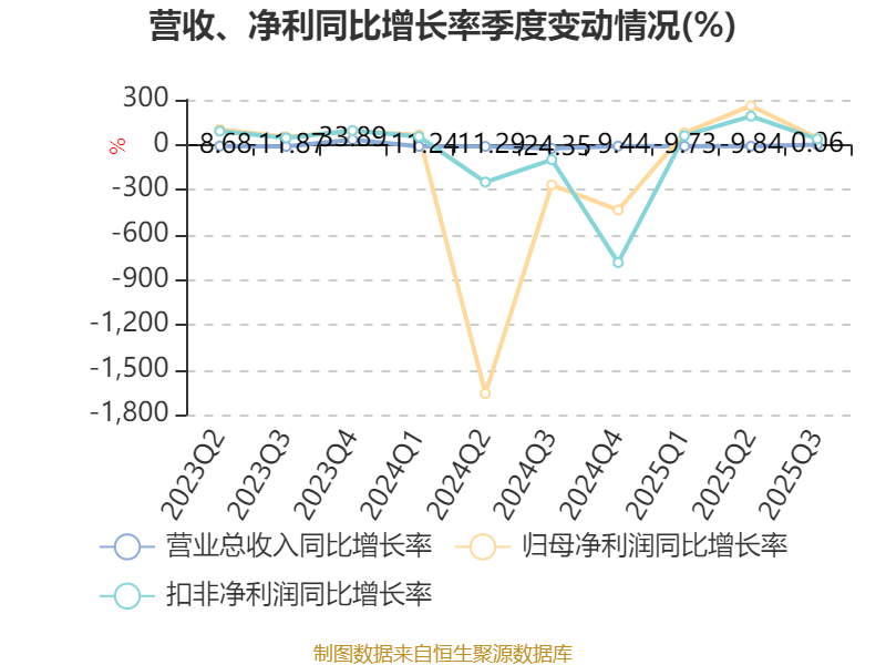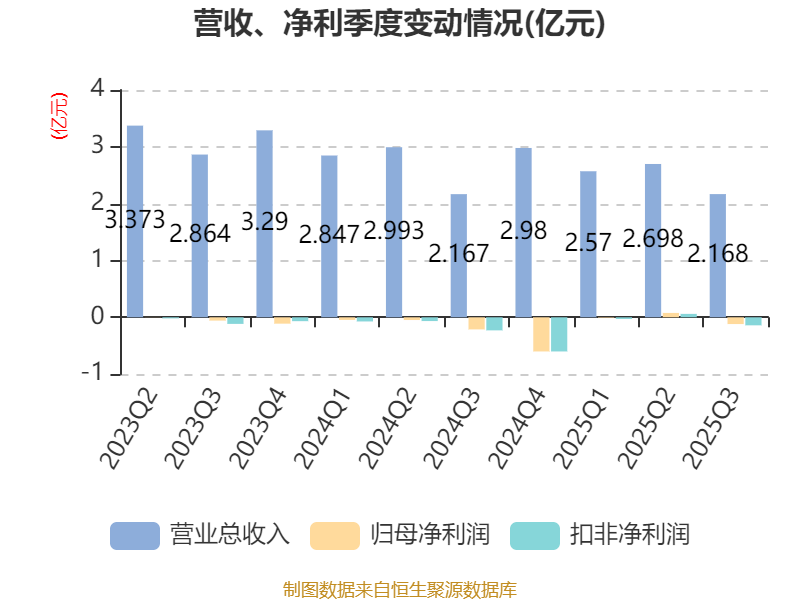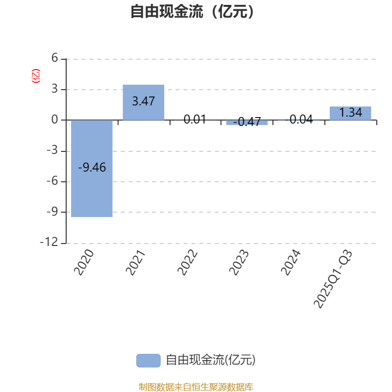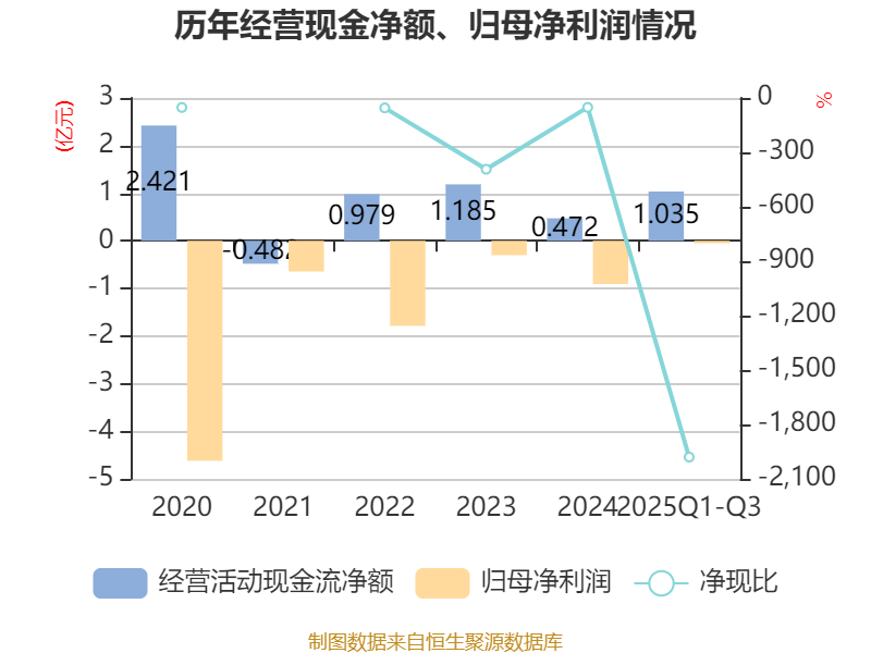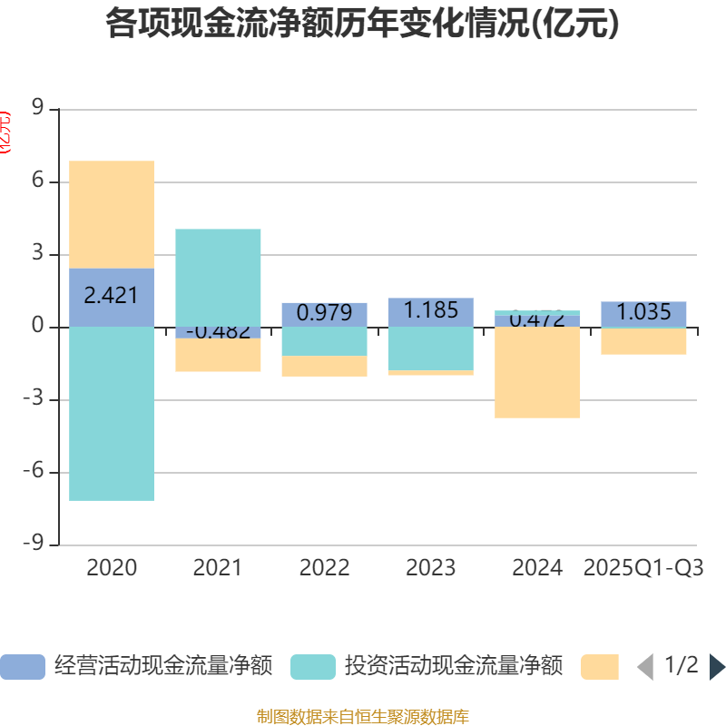 2025年前三季度,公司经营活动现金流净额为1.03亿元,同比增长397.7%;筹资活动现金流净额-1.08亿元,同比增加2.41亿元;投资活动现金流净额-730.45万元,上年同期为3353.73万元。