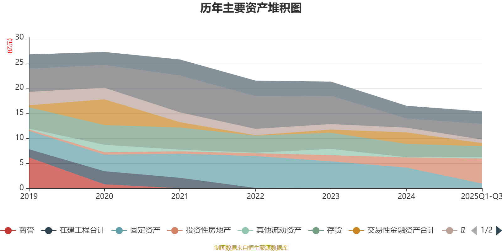 资产重大变化方面,截至2025年三季度末,公司投资性房地产较上年末增加145.57%,占公司总资产比重上升20.17个百分点;固定资产较上年末减少77.03%,占公司总资产比重下降18.88个百分点;交易性金融资产合计较上年末减少73.57%,占公司总资产比重下降10.06个百分点;货币资金较上年末增加71.43%,占公司总资产比重上升9.31个百分点。