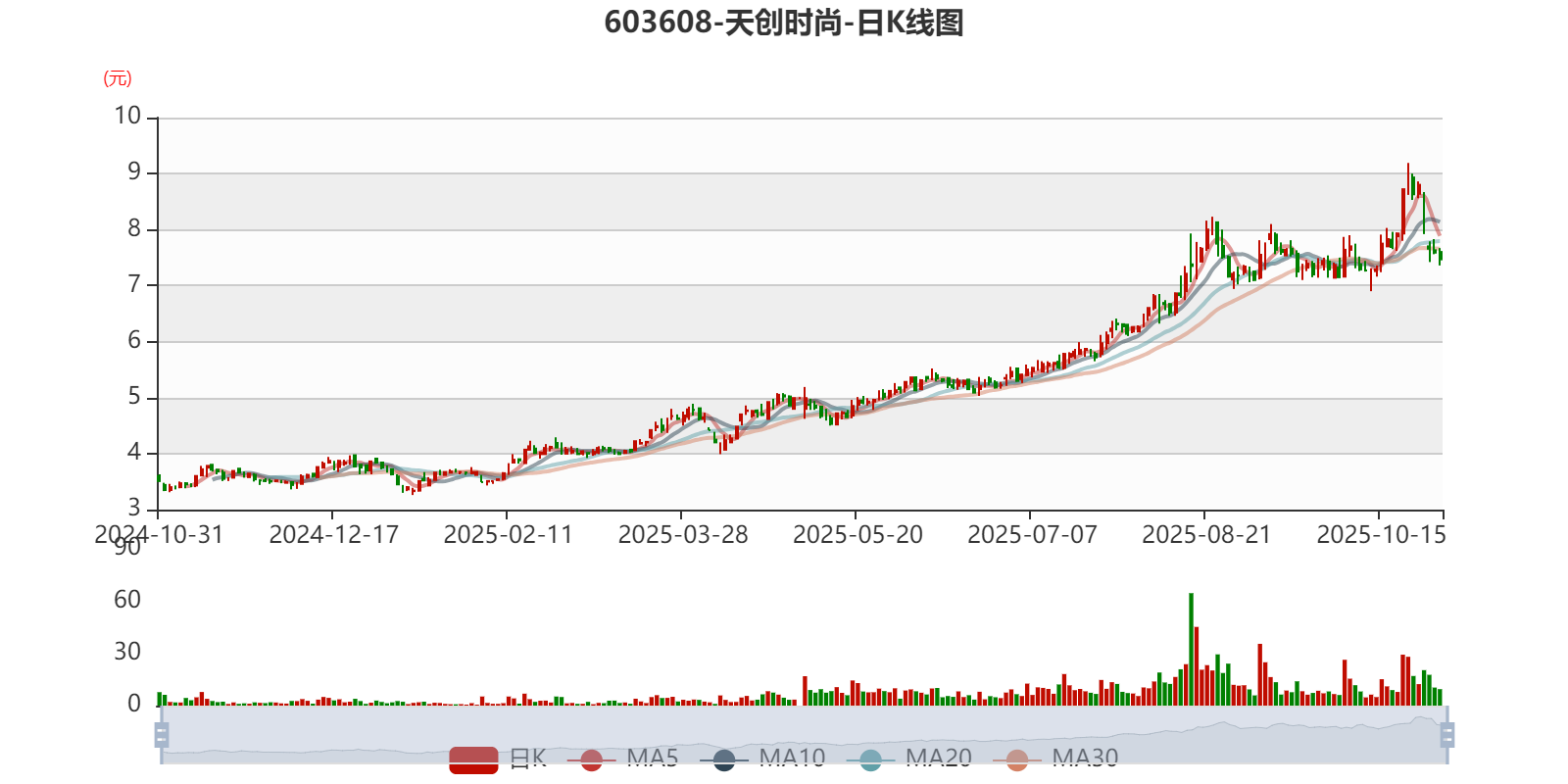以10月30日收盘价计算,天创时尚目前市盈率(TTM)约为-48.03倍,市净率(LF)约2.93倍,市销率(TTM)约3.01倍。