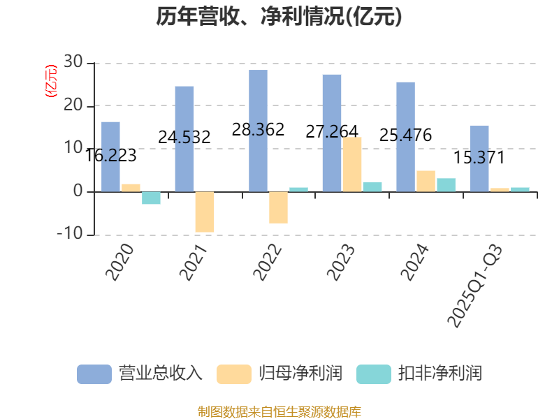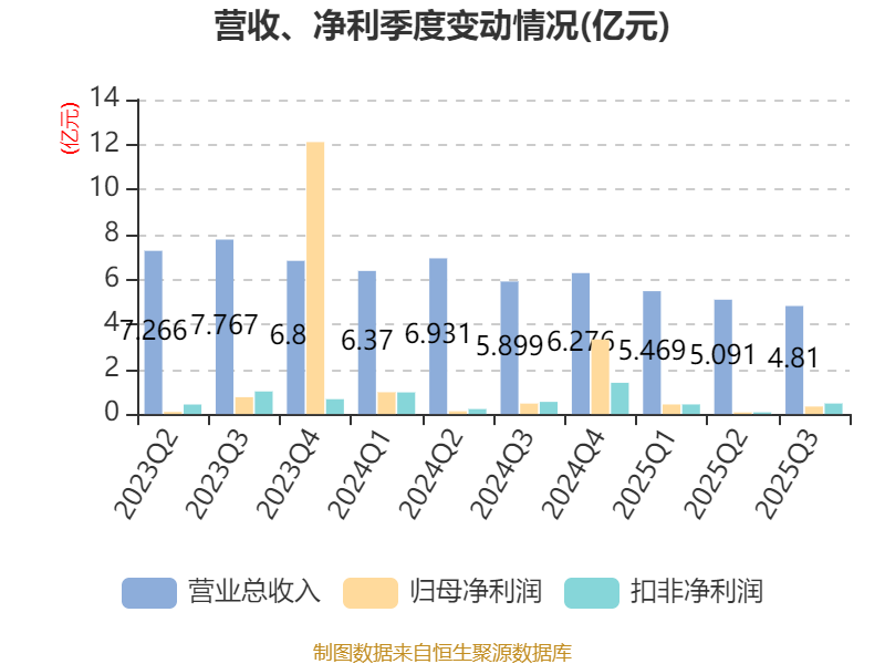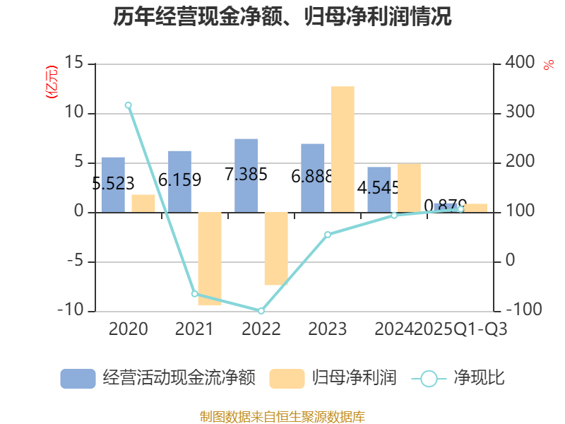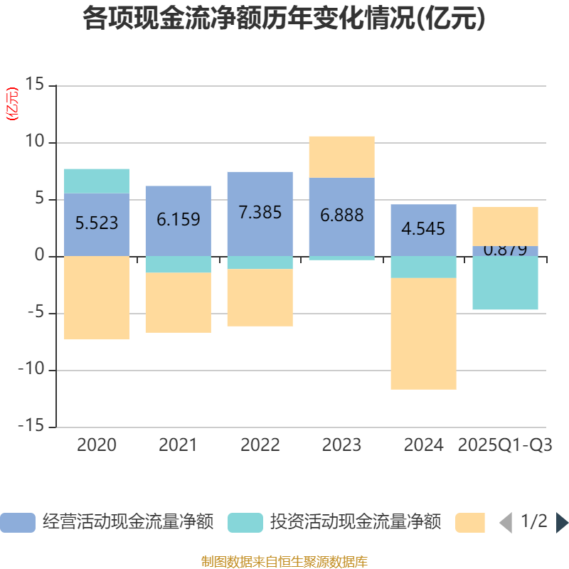 2025年前三季度,公司经营活动现金流净额为8794.86万元,同比下降71.92%;筹资活动现金流净额3.43亿元,同比增加11.06亿元;投资活动现金流净额-4.7亿元,上年同期为-1.71亿元。