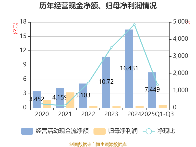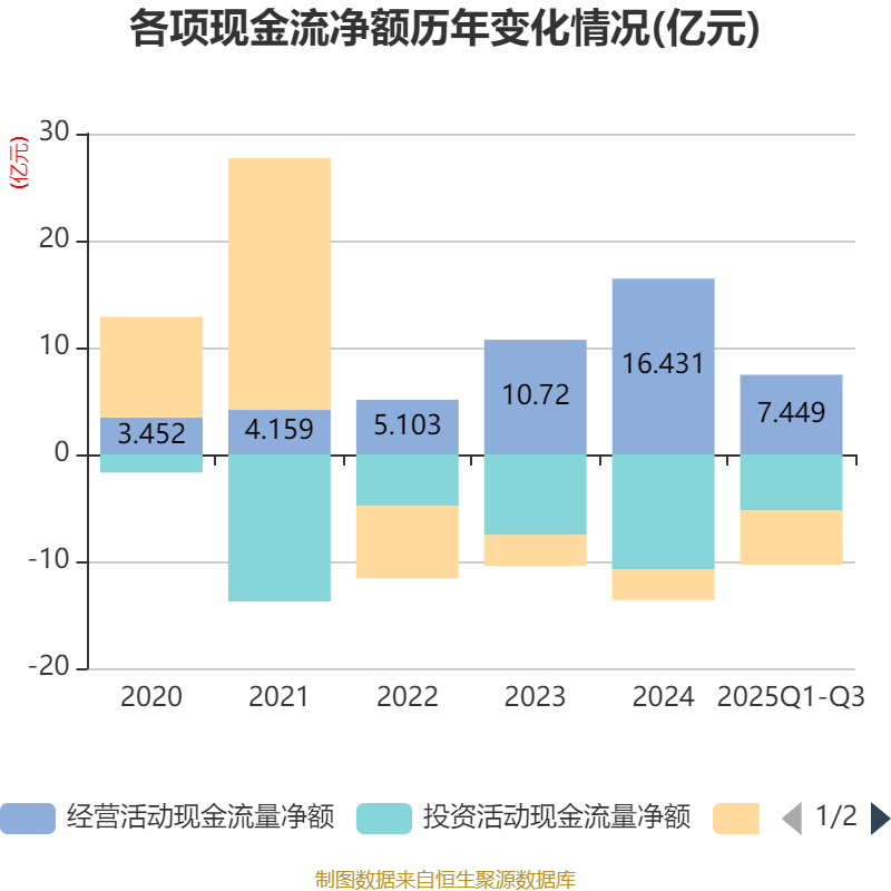 2025年前三季度,公司经营活动现金流净额为7.45亿元,同比下降57.72%;筹资活动现金流净额-5.08亿元,同比减少4.04亿元;投资活动现金流净额-5.25亿元,上年同期为-9.59亿元。