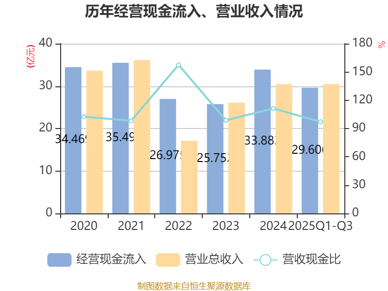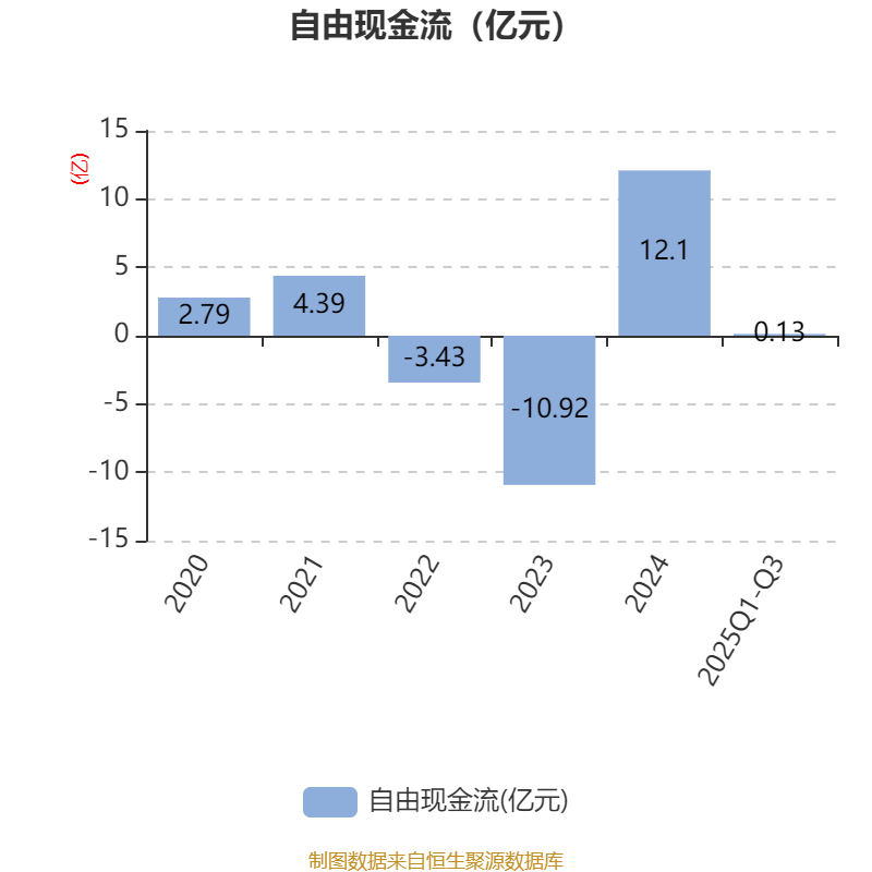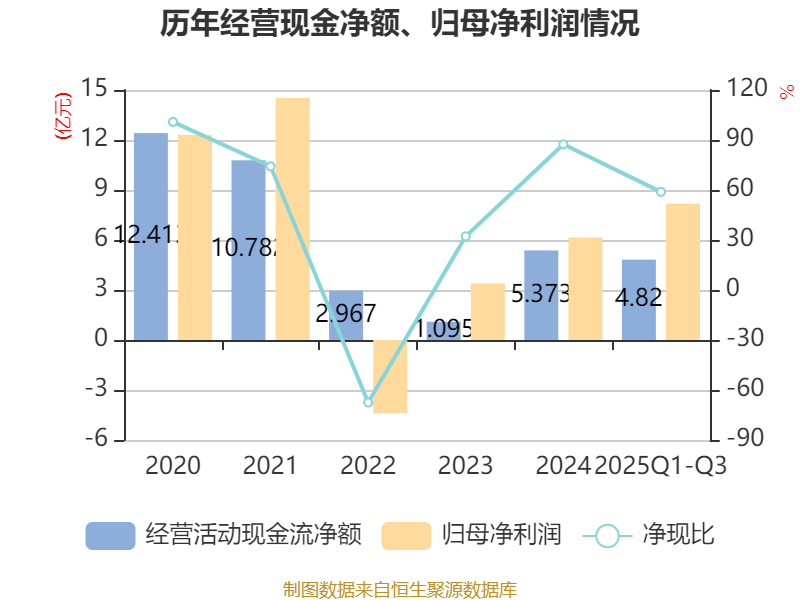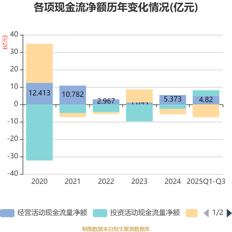 2025年前三季度,公司经营活动现金流净额为4.82亿元,同比增长3.57%;筹资活动现金流净额-7.37亿元,同比减少7.39亿元;投资活动现金流净额3.32亿元,上年同期为-4.8亿元。