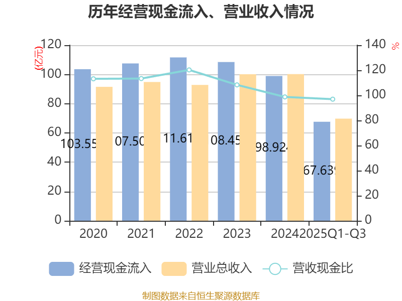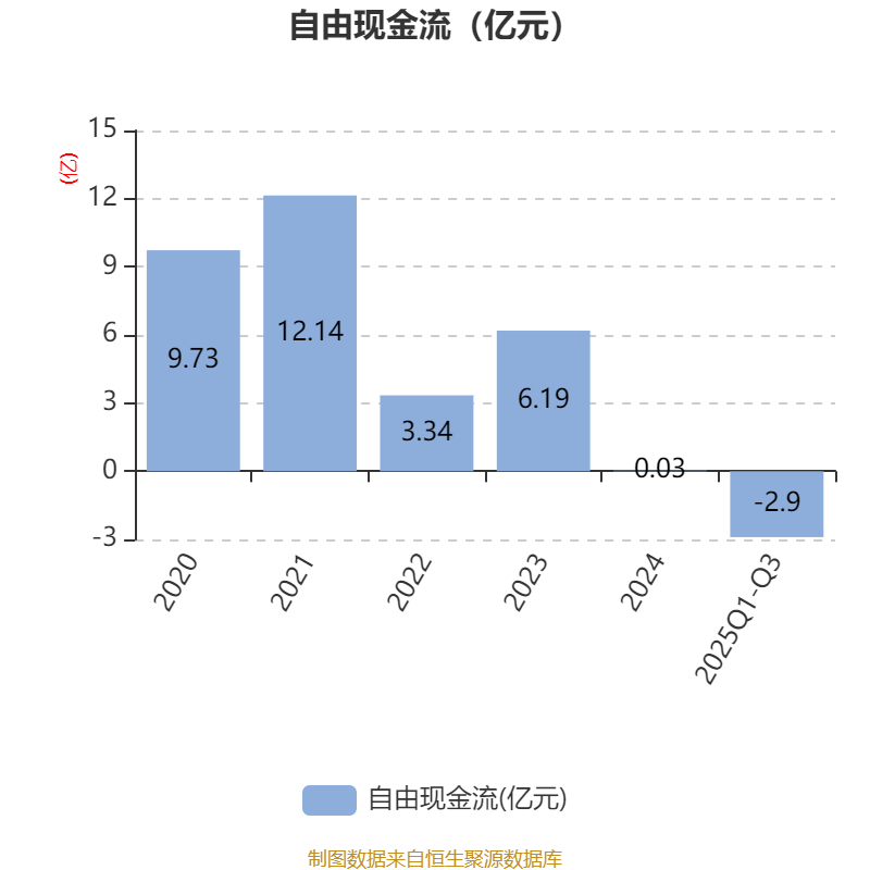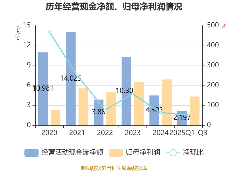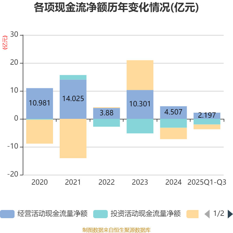 2025年前三季度,公司经营活动现金流净额为2.2亿元,同比增加2.56亿元;筹资活动现金流净额-1.7亿元,同比增加2.23亿元;投资活动现金流净额-2.02亿元,上年同期为-2.64亿元。