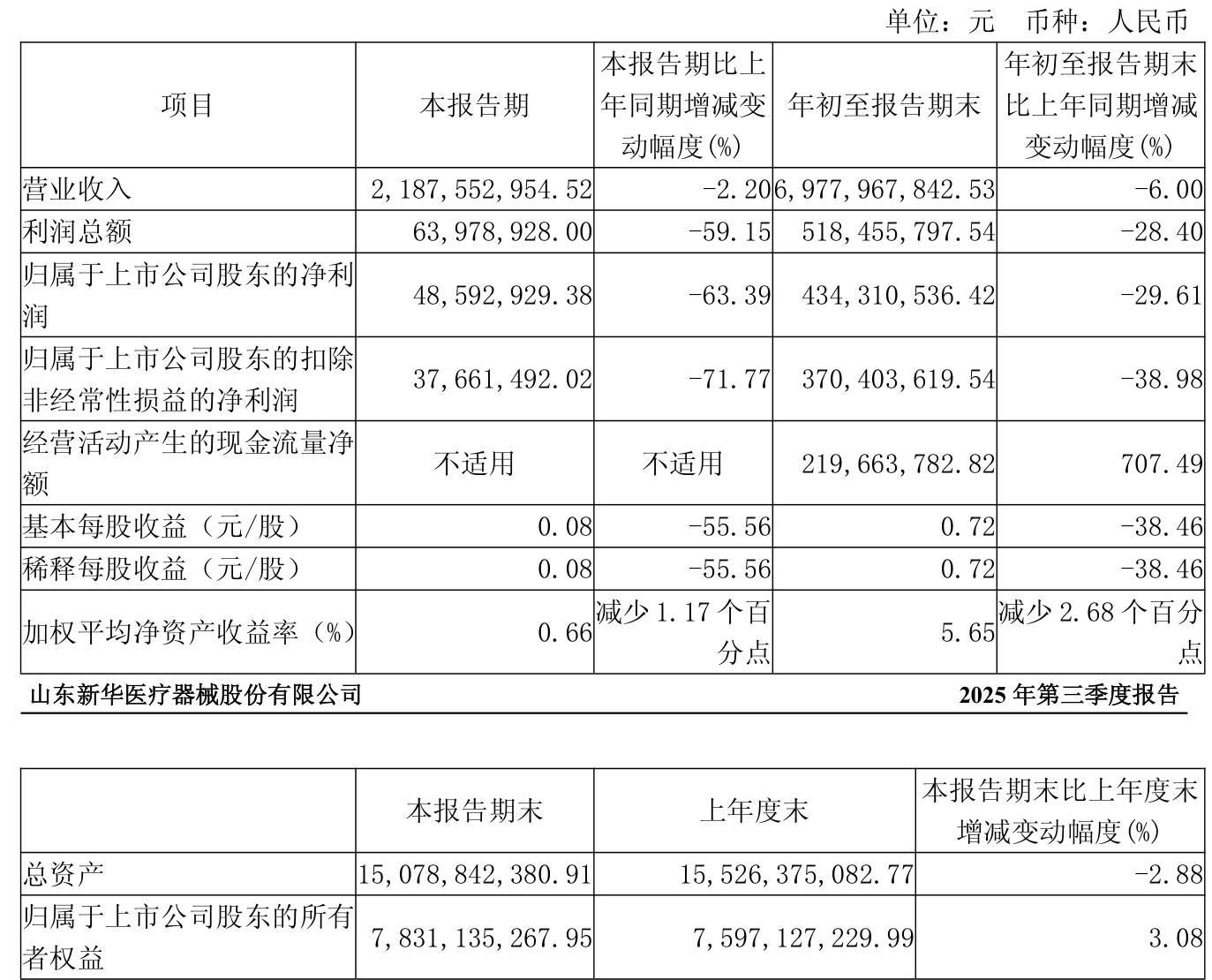 中证智能财讯新华医疗(600587)10月31日披露2025年第三季度报告。前三季度公司实现营业总收入69.78亿元,同比下降6.00%;归母净利润4.34亿元,同比下降29.61%;扣非净利润3.7亿元,同比下降38.98%;经营活动产生的现金流量净额为2.2亿元,上年同期为-3615.9万元;报告期内,新华医疗基本每股收益为0.72元,加权平均净资产收益率为5.65%。