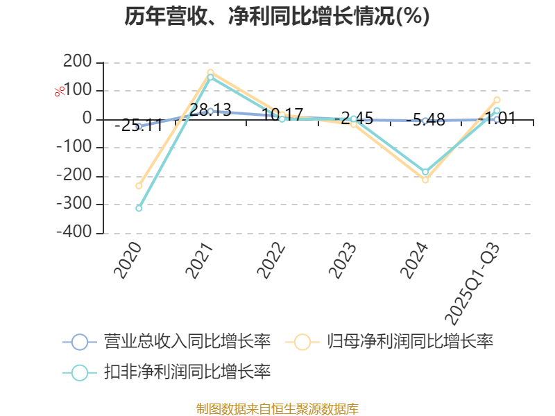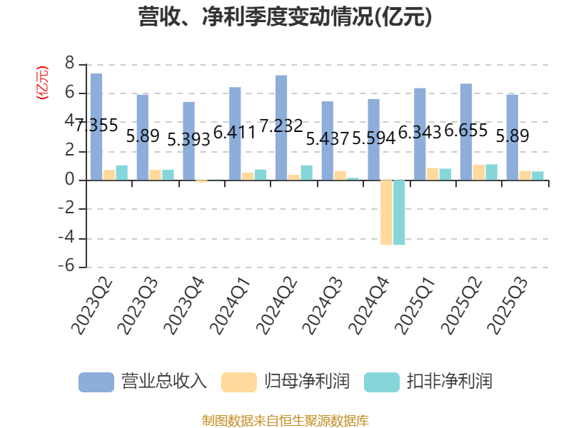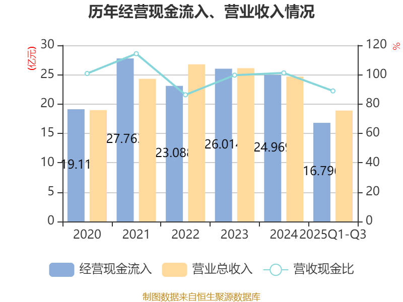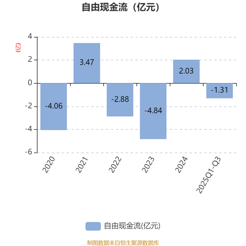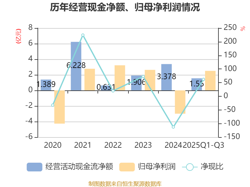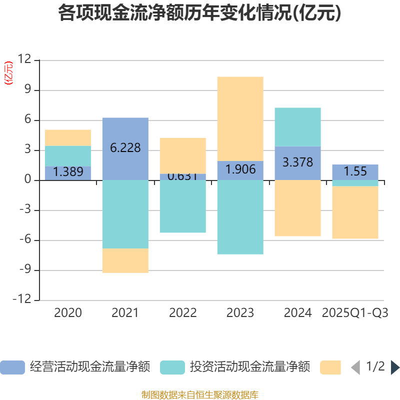 2025年前三季度,公司经营活动现金流净额为1.55亿元,同比下降48.42%;筹资活动现金流净额-5.24亿元,同比增加3.38亿元;投资活动现金流净额-6314.93万元,上年同期为1.21亿元。