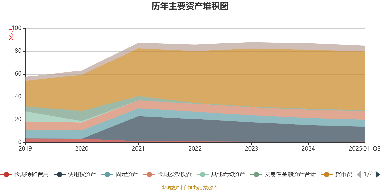 资产重大变化方面,截至2025年三季度末,公司货币资金较上年末增加0.41%,占公司总资产比重上升1.69个百分点;使用权资产较上年末减少10.77%,占公司总资产比重下降1.43个百分点;长期股权投资较上年末增加5.05%,占公司总资产比重上升0.63个百分点;交易性金融资产合计较上年末减少40.27%,占公司总资产比重下降0.43个百分点。