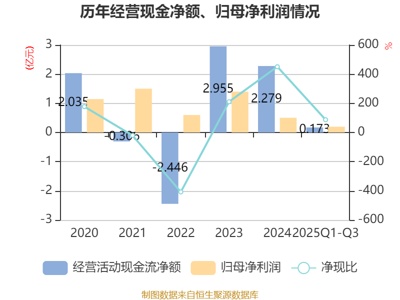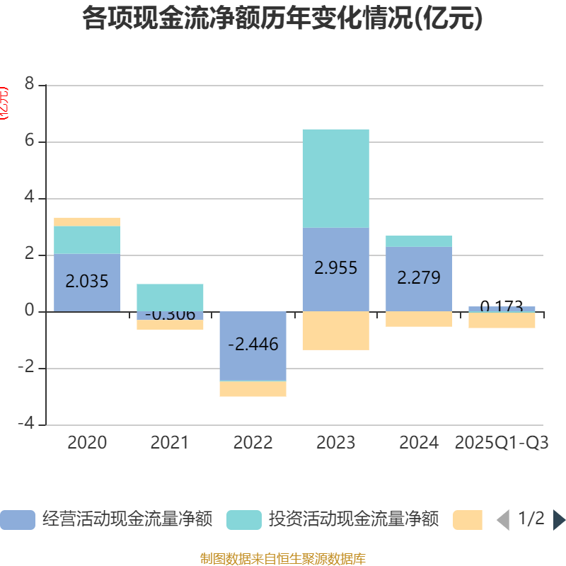 2025年前三季度,公司经营活动现金流净额为1727.1万元,同比增长115.36%;筹资活动现金流净额-5418.55万元,同比减少3743.99万元;投资活动现金流净额-484.76万元,上年同期为230.97万元。