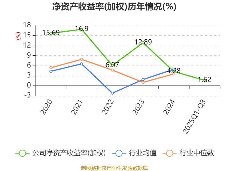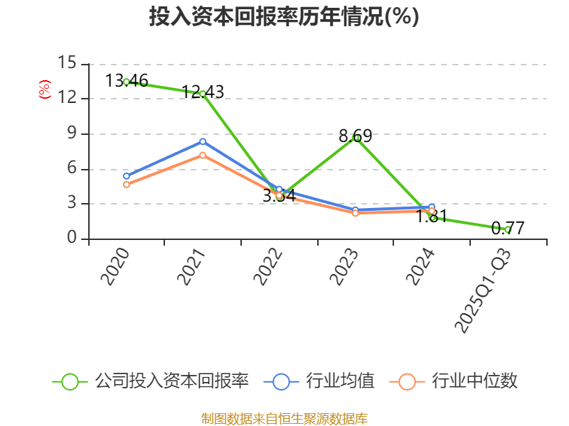 盈利能力方面, 2025年前三季度公司加权平均净资产收益率为1.62%,同比下降2.27个百分点。公司2025年前三季度投入资本回报率为0.77%,较上年同期下降1.53个百分点。