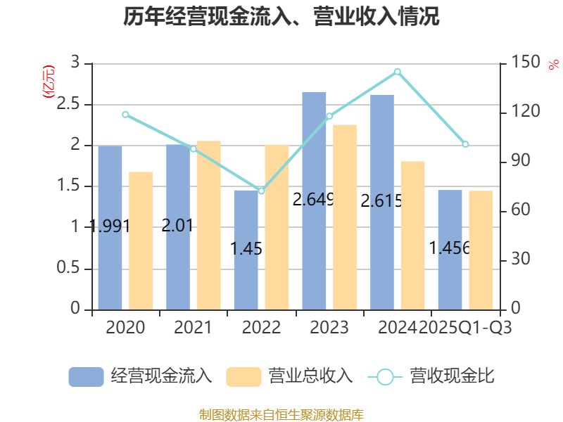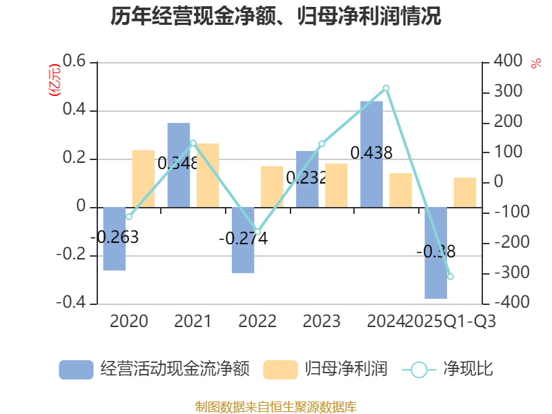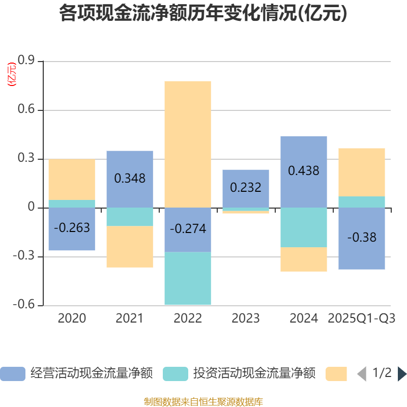 2025年前三季度,公司经营活动现金流净额为-3799.35万元,同比减少7110.64万元;筹资活动现金流净额2948.14万元,同比增加4288.5万元;投资活动现金流净额694.7万元,上年同期为-1375.11万元。