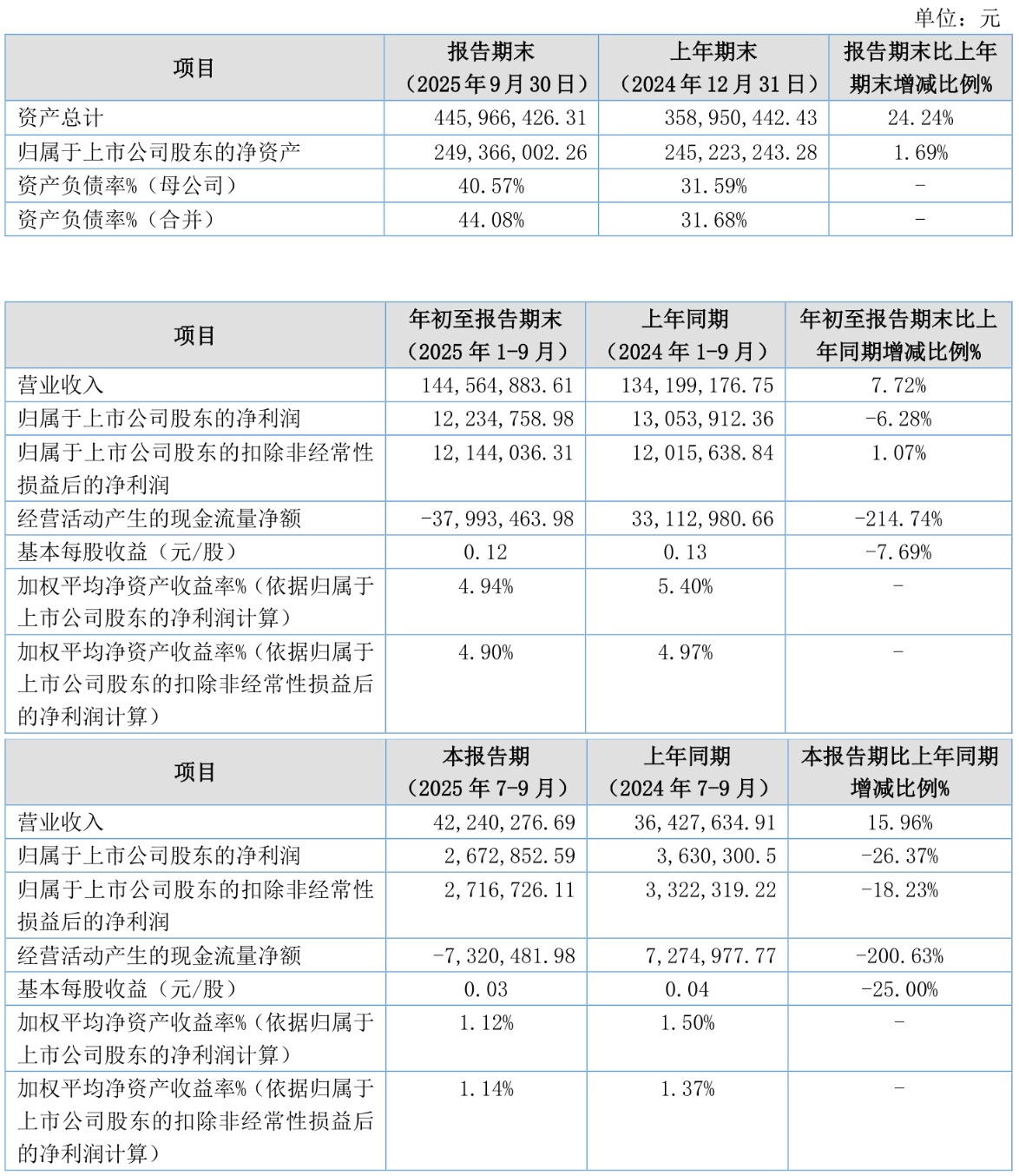 2025年前三季度,公司流动比率为1.85,速动比率为1.47。