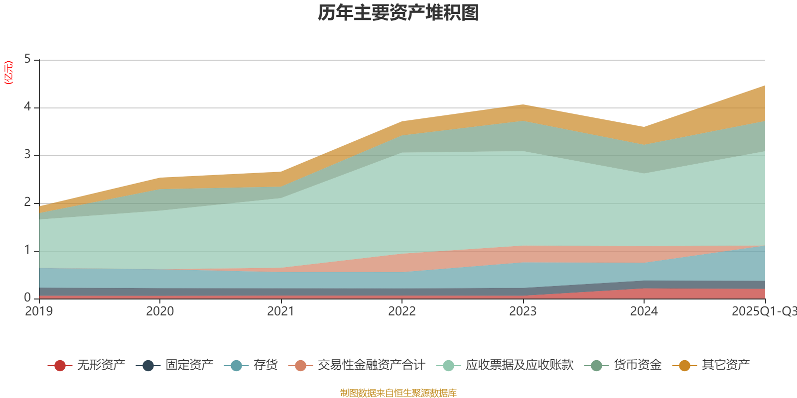 资产重大变化方面,截至2025年三季度末,公司交易性金融资产合计较上年末减少100%,占公司总资产比重下降9.75个百分点;存货较上年末增加98.15%,占公司总资产比重上升6.17个百分点;货币资金较上年末增加4.98%,占公司总资产比重下降2.6个百分点;在建工程合计较上年末增加135.48%,占公司总资产比重上升2.24个百分点。